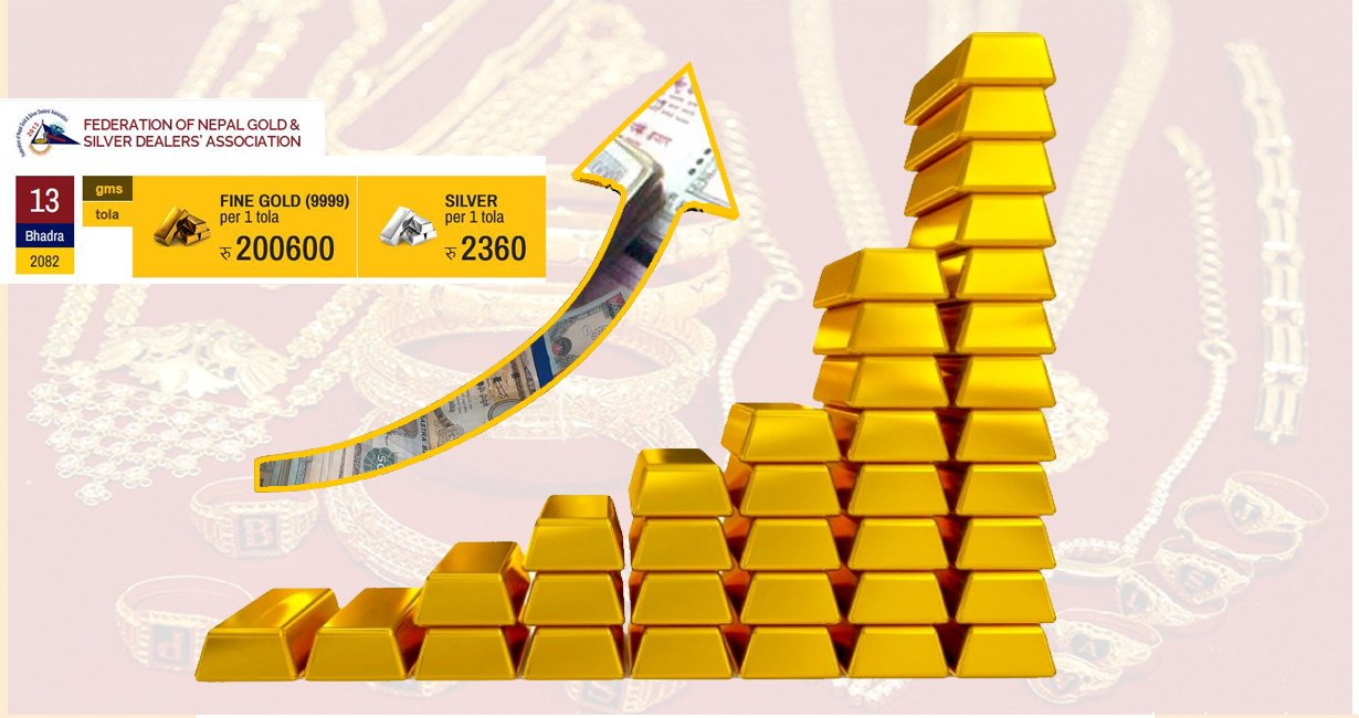 काठमाडौं । नेपाली बजारमा सुनको मूल्य तोलाकै २ लाख नाघेको छ । यो मूल्य हालसम्मकै उच्च हो ।