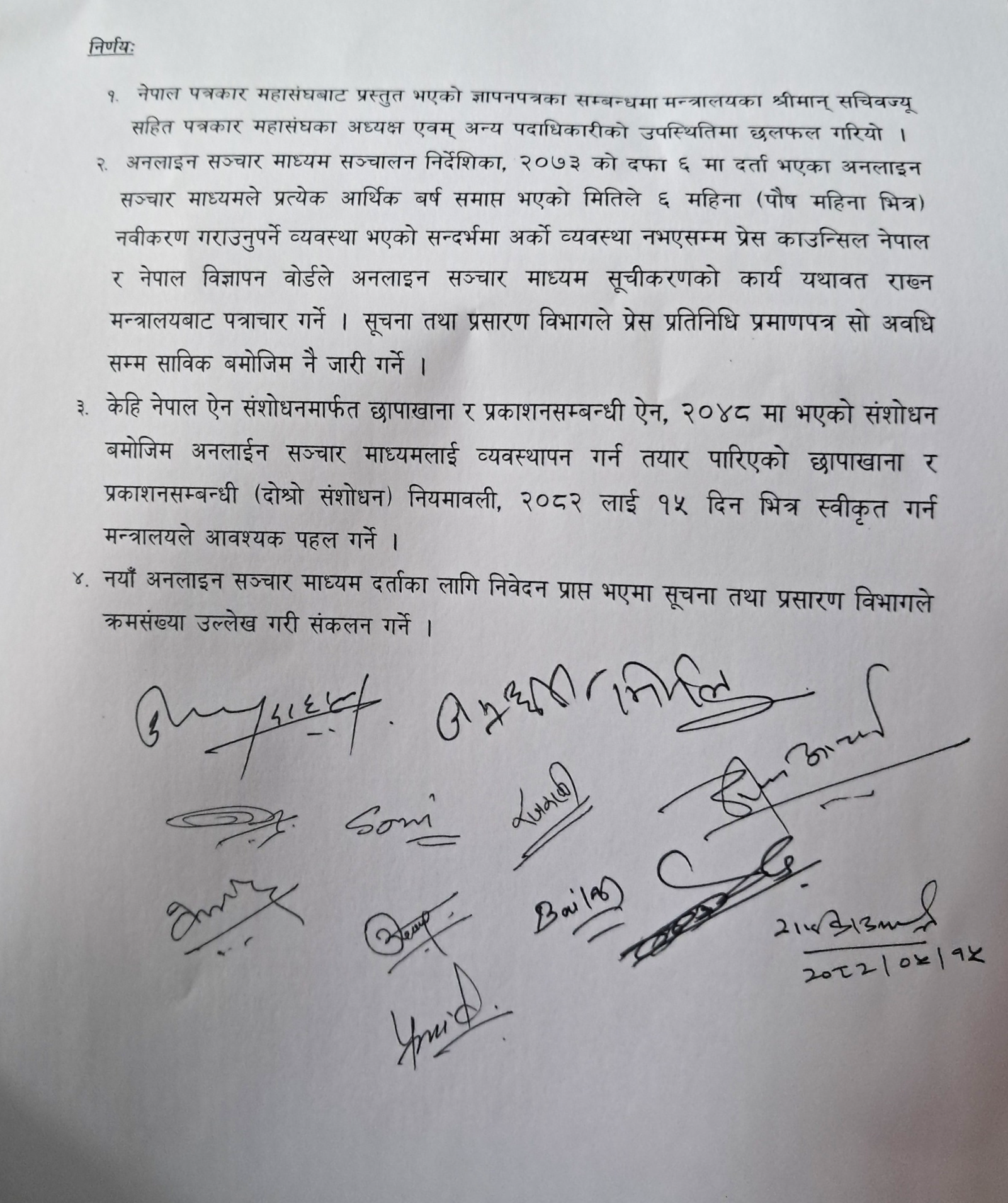 नेपाल पत्रकार महासंघले बुझाएको ज्ञापनपत्रका सन्दर्भमा मन्त्रालयका सचिव, महासंघका अध्यक्ष तथा पदाधिकारीहरूको उपस्थितिमा छलफलपश्चात सहमति गरिएको हो।