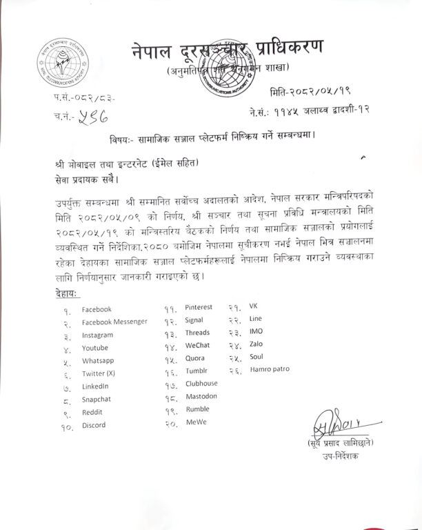 सञ्चार तथा सूचना प्रविधि मन्त्रालयले बिहीबार गरेको निर्णयअनुसार नेपाल दूरसञ्चार प्राधिकरणले फेसबुकसहितका २६ वटा सामाजिक सञ्जाल बन्द गर्न इन्टरनेट सेवा प्रदायक कम्पनीहरूलाई निर्देशन दिएको हो ।