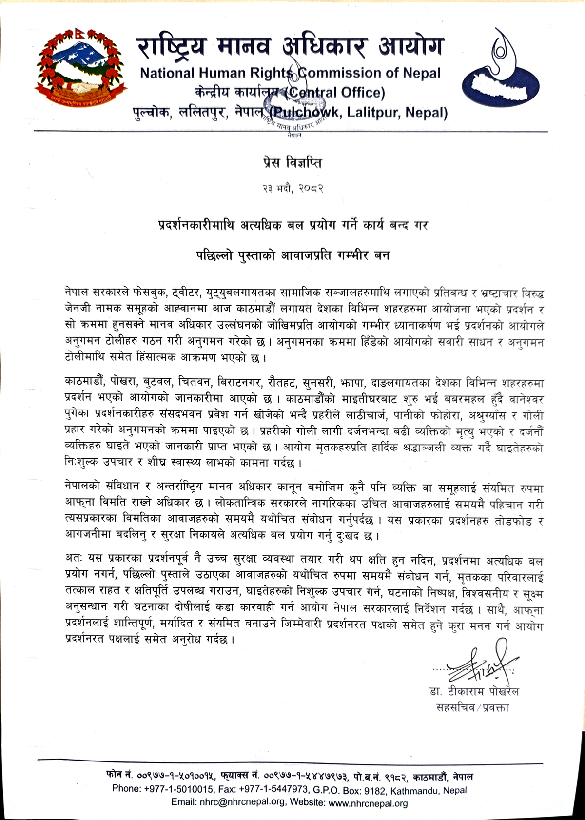 ‘नेपालको संविधान र अन्तर्राष्ट्रिय मानव अधिकार कानुन बमोजिम कुनै पनि व्यक्ति वा समूहलाई संयमित रूपमा आफ्ना विमति राख्ने अधिकार छ। लोकतान्त्रिक सरकारले नागरिकका उचित आवाजहरूलाई समयमै पहिचान गरी त्यस प्रकारका विमतिका आवाजहरूको समयमै यथोचित सम्बोधन गर्नुपर्दछ। यस प्रकारका प्रदर्शनहरू तोडफोड र आगजनीमा बदलिनु र सुरक्षा निकायले अत्यधिक बल प्रयोग गर्नु दुःखद छ,’ आयोगले भनेको छ।