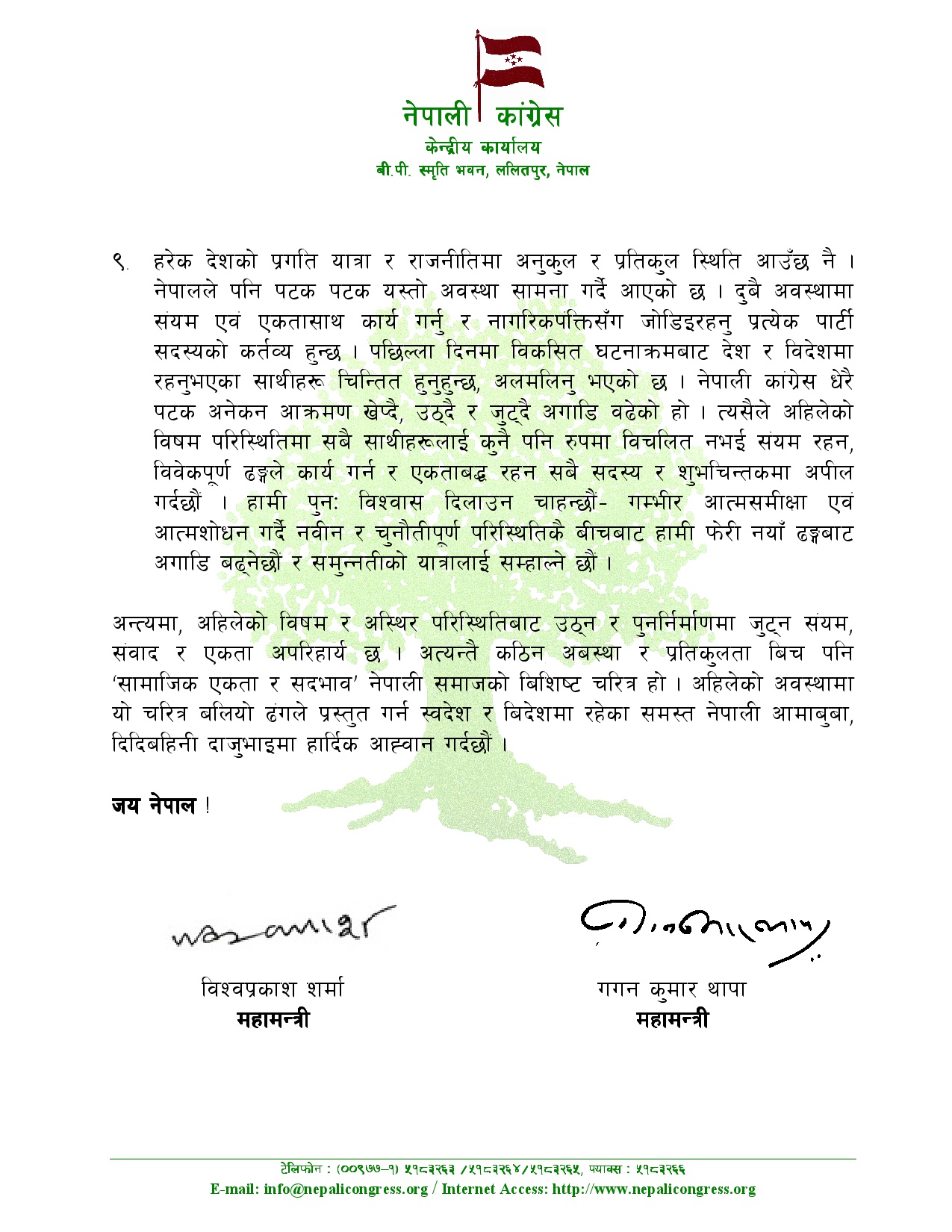 कांग्रेसले जेनजी पुस्ताको भावना बमोजिम नै निष्कर्षमा पुर्याउन पनि आग्रह गरेको छ। तर, उक्त निर्णय पनि संविधान बमोजिम वैधानिक बाटोबाट नै अगाडिको यात्रा तय गर्न सकिन्छ र गर्नुपर्छ भन्ने कुराको स्मरण गराएका छन्। ‘विधि विहीनताले थप अराजकता निम्त्याउँछ, त्यसैले वार्ताका क्रममा राष्ट्रपतिज्यु र जेनजी पक्षलाई हामी आग्रह गर्छौं- अब देश चलाउन र निर्वाचन गर्न नयाँ राजनीतिक संरचना बनाउँदा देशमा लामो संवैधानिक रिक्तता र शून्यता आउन नदिन हरसम्भव वैड्ढानिक उपाय अपनाइयोस्, संविधान र लोकतान्त्रिक बाटोाट नै समाधान खोज्दै यो बेथितिको अन्त्यको मार्गचित्र तय गरियोस्। त्यसमा हाम्रो समर्थन रहनेछ,’ विज्ञप्तिमा भनिएको छ।