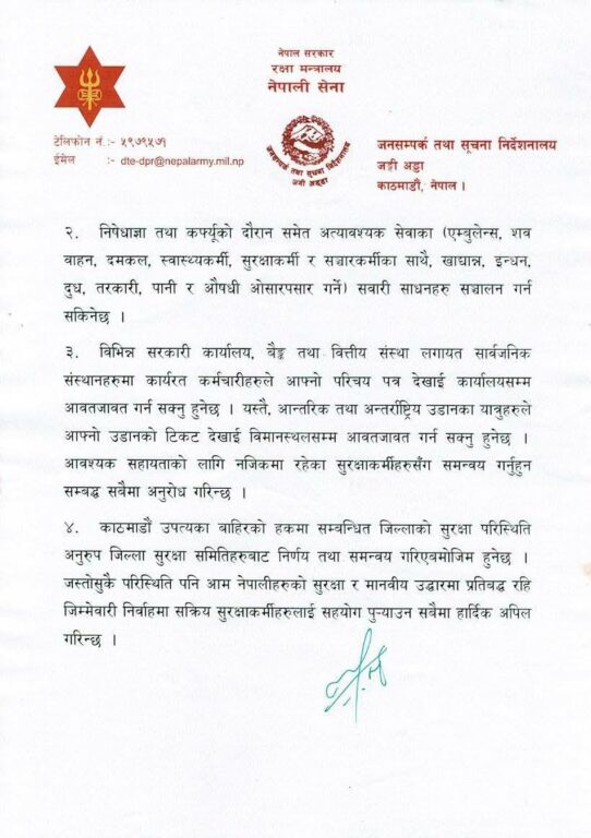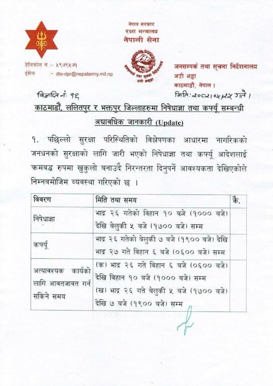 यस्तै, भदौ २६ गते बेलुकी ७ बजेदेखि भदौ २७ गते बिहान ५ बजेसम्म उपत्यकाभर कर्फ्यु आदेश लागू हुने जानकारी सेनाले दिएको छ।