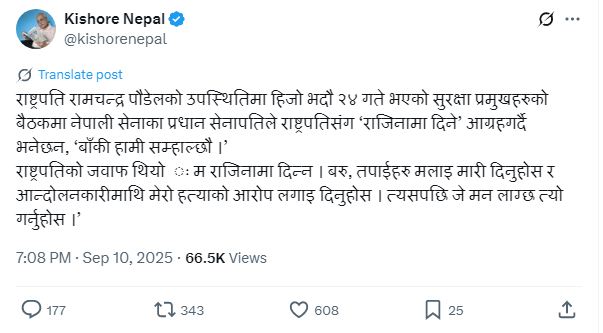 वरिष्ठ पत्रकार नेपालले एक्समा बुधबार राष्ट्रपति पौडेलको उपस्थितिमा सुरक्षा प्रमुखहरूको बैठक बसेको र बैठकमा प्रधान सेनापति सिग्देलले राष्ट्रपतिसँग ‘राजीनामा दिन’ आग्रह गरेको दाबी गरेका छन्।