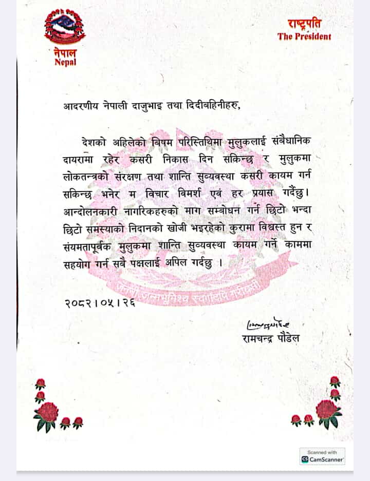 काठमाडौं । देशको पछिल्लो विषम परिस्थितिलाई राष्ट्रपति रामचन्द्र पौडेलले संवैधानिक दायरामा रहेर निकास दिनका लागि आफूले प्रयास गरिरहेको बताउनुभएको छ ।