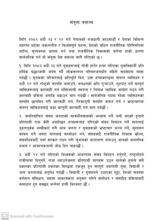 ‘उक्त हत्याकाण्डमा संलग्न व्यक्तिहरू र भदौ २४ गते राष्ट्रको सम्पत्ति जलाउने, जनधनको क्षति पुर्याउने, लुटपाट गर्ने सम्पूर्ण व्यक्तिहरूलाई कारबाही गर्न शक्तिशाली स्वतन्त्र र निष्पक्ष न्यायिक आयोग गठन गरी कारबाही प्रक्रिया अगाडि बढाउन माग गर्दछौँ,’ विज्ञप्तिमा भनिएको छ ।