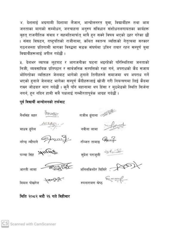 विद्यार्थी संगठनहरूका पूर्व अध्यक्षहरूले संसद् विघटन, राष्ट्रपतिको राजीनामा, स्वतन्त्र व्यक्तिको नेतृत्वमा सरकार गठनजस्ता प्रतिगामी मागविरुद्धमा सडक संघर्षमा उत्रिनका लागि तयार रहन युवा र विद्याथीहरूलाई अपिल पनि गरेका छन् ।