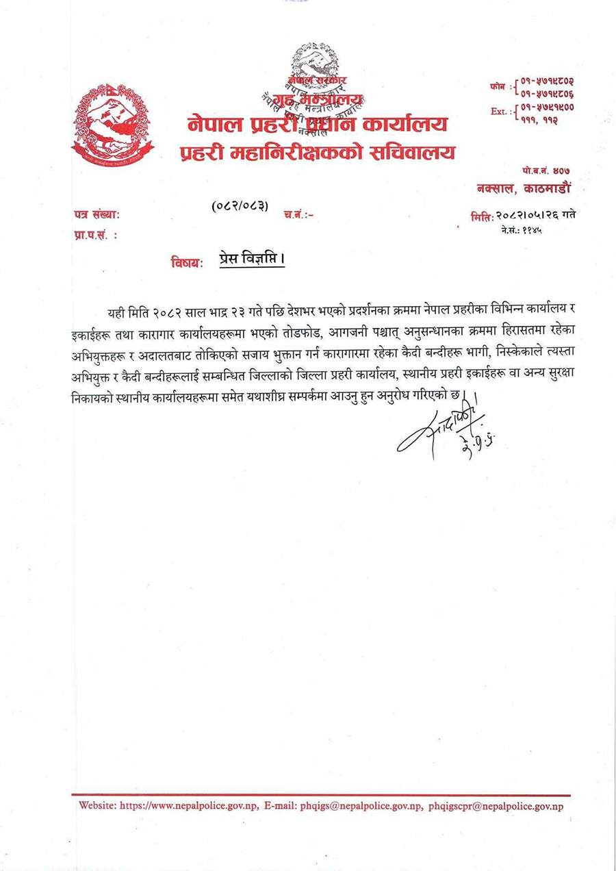आज प्रहरी प्रधान कार्यालयले विज्ञप्ति निकालेर ‘जेन–जी’ प्रदर्शनका क्रममा भागेका अभियुक्त र कैदीबन्दीलाई सम्बन्धित जिल्ला प्रहरी कार्यालय, स्थानीय प्रहरी इकाइ वा अन्य सुरक्षा निकायको स्थानीय कार्यालयहरूमा सम्पर्क गर्न आग्रह गरेको हो ।