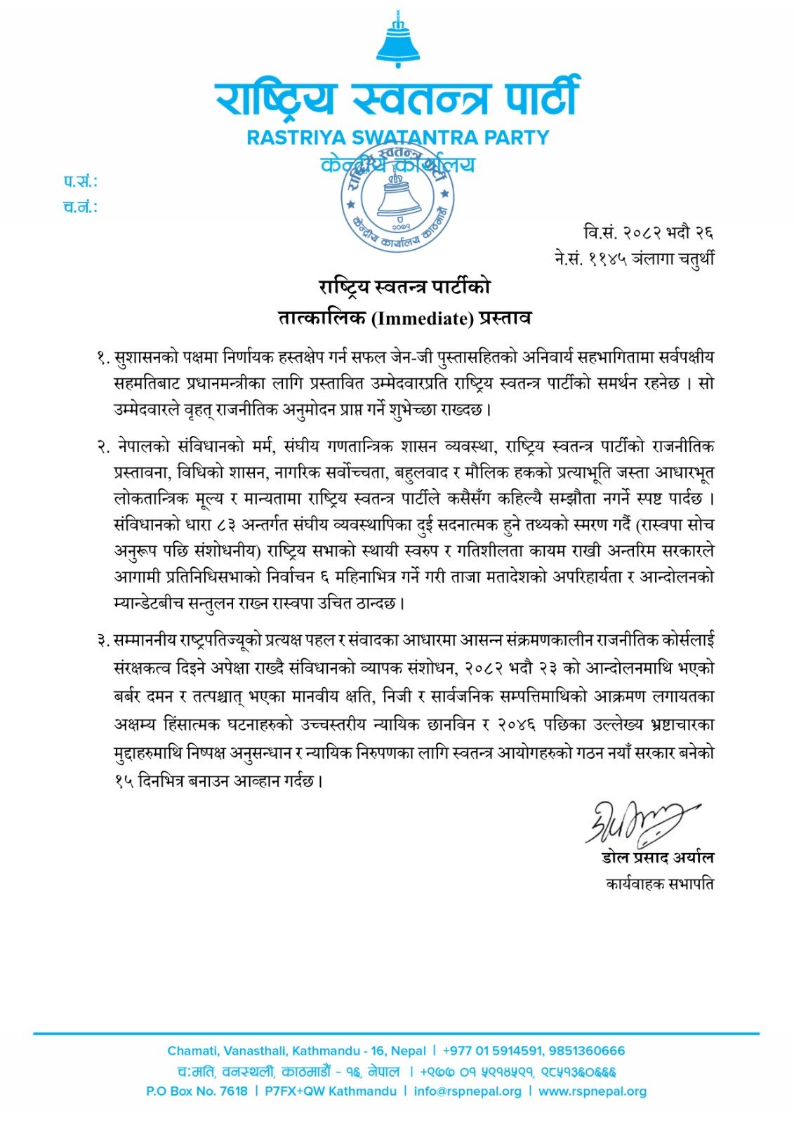 रास्वपाले आज तीन बुँदे तात्कालीन प्र्रस्ताव जारी गर्दै नेपालको संविधानको मर्म, सङ्घीय गणतान्त्रिक शासन व्यवस्था, विधिको शासन, नागरिक सर्वोच्चता, बहुलवाद र मौलिक हकको प्रत्याभूति जस्ता आधारभूत लोकतान्त्रिक मूल्य र मान्यता कसैसँग कहिल्यै सम्झौना नगर्ने स्पष्ट पारेको हो ।