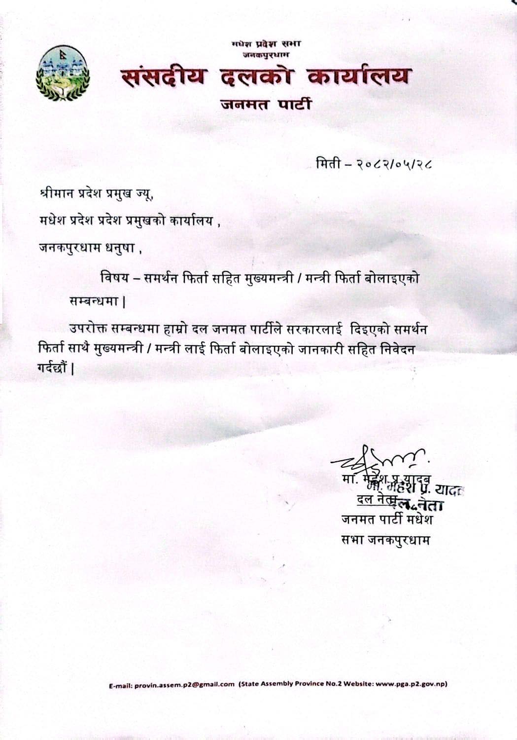 काठमाडौँ । जनमत पार्टीले मधेस प्रदेश सरकारमा रहेका आफ्ना प्रतिनिधिहरू—मुख्यमन्त्रीसहित तीन मन्त्रीलाई फिर्ता बोलाएको छ ।