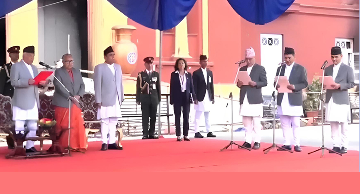 केहीबेरअघि शीतल निवासमा आयोजित समारोहमा राष्ट्रपति रामचन्द्र पौडेलले नवनियुक्त मन्त्रीहरू ओमप्रकाश अर्याल, रामेश्वर खनाल र कुलमान घिसिङलाई शपथ गराएका हुन् ।