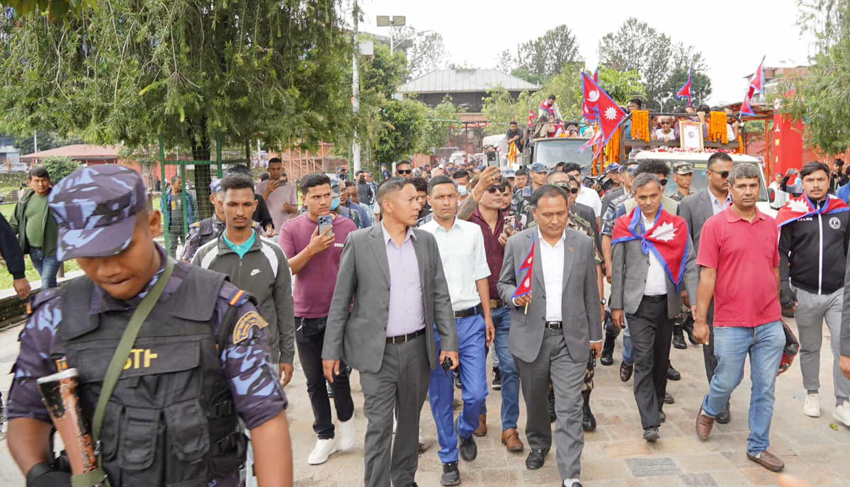 काठमाडौं । जेनजी आन्दोलनका क्रममा ज्यान गुमाएका नागरिकहरूको सम्मानमा निकालिएको शवयात्रामा ऊर्जामन्त्री कुलमान घिसिङ र गृहमन्त्री तथा कानुनमन्त्री ओमप्रकाश अर्याल सहभागी भएका छन् ।