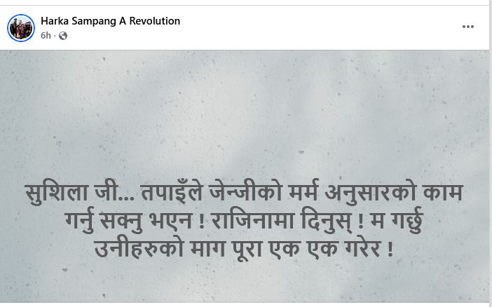 उनले भनेका छन्, “सुशीला जी, तपाईँले जेनजी आन्दोलनको मर्मअनुसार कार्य गर्न सक्नु भएन, कृपया राजीनामा दिनुहोस् । म ती मागहरू क्रमशः पूरा गर्ने जिम्मेवारी लिन्छु।”