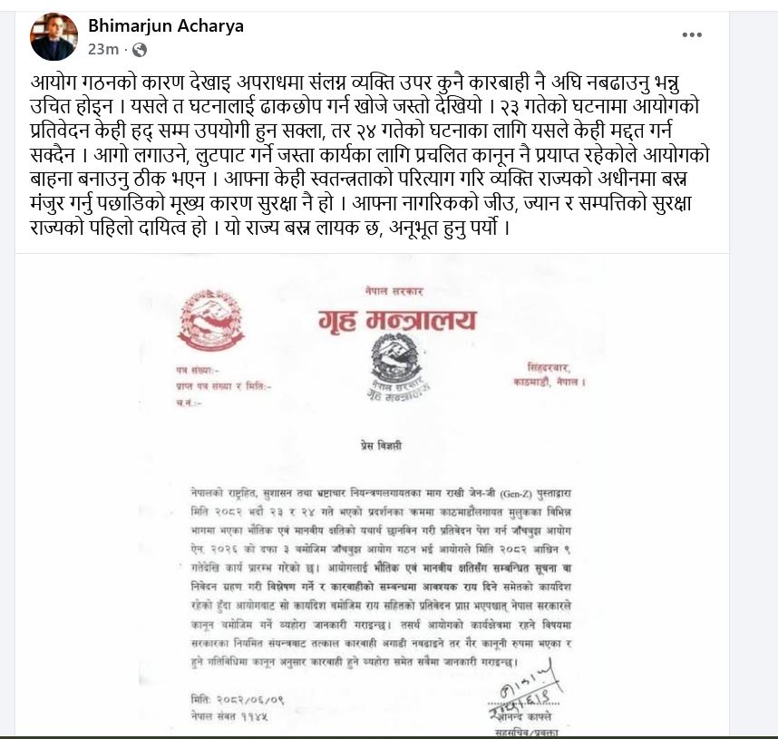 गृह मन्त्रालयले जेनजी आन्दोलनका नाममा भएका गैरकानूनी र अपराधिक कार्य गर्नेलाई कारवाही नगर्न मातहतका निकायलाई निर्देशन दिएपछि संविधानविद् आचार्यले भनेका छन् –“आयोगको बाहनामा कानुनी प्रक्रिया अवरुद्ध गर्नु अनुचित हो,” उनले स्पष्ट पारे ।