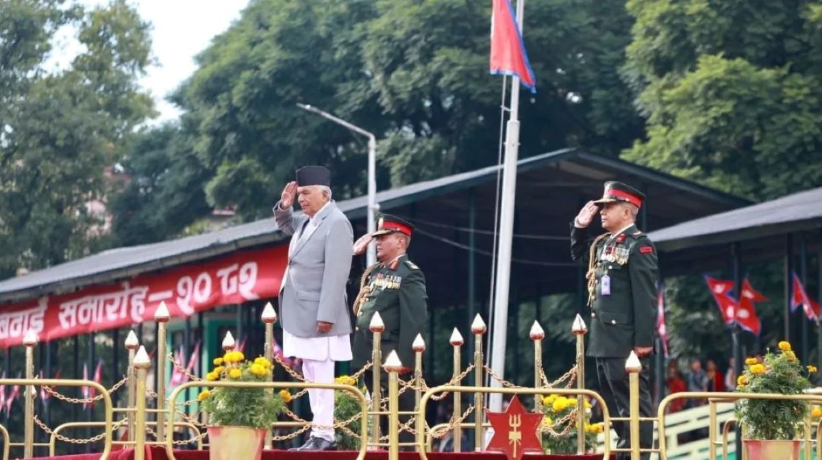 काठमाडौँ । राष्ट्रपति रामचन्द्र पौडेलको प्रमुख आतिथ्यमा सैनिक मञ्च टुँडिखेलमा आज अपराह्न ‘फूलपाती बढाइँ समारोह–२०८२’ सम्पन्न गरिएको छ । समारोहमा नेपाली सेनाका परमाधिपति राष्ट्रपति पौडेलको सम्मानमा नेपाली सेनाले सलामी अर्पण गरेको थियो ।