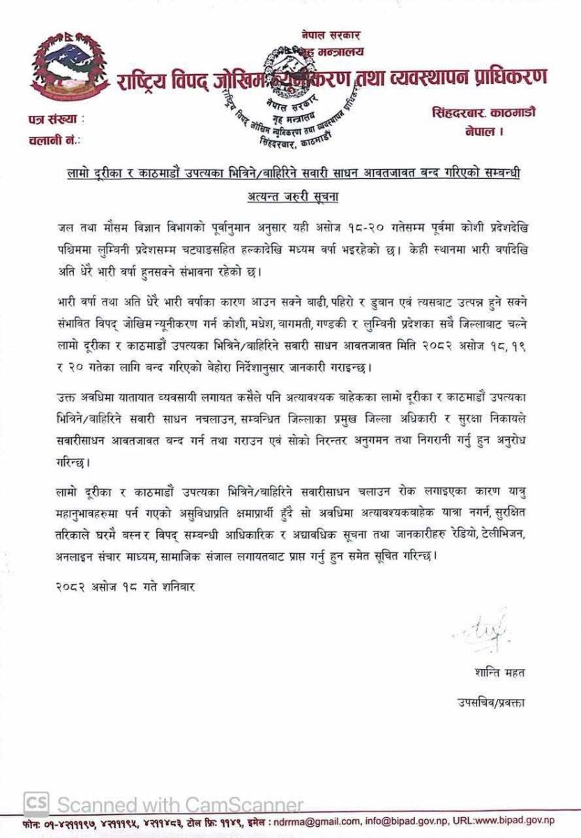 राष्ट्रिय विपद जोखिम न्यूनीकरण तथा व्यवस्थापन प्राधिकरणले आज एक विज्ञप्ति जारी गर्दै यस्तो जानकारी दिएको हो। यात्रामा जोखिम रहेकाले काठमाडौं उपत्यका भित्रिन र काठमाडौं उपत्यकाबाट बाहिरिन तीन दिनसम्म रोक लगाइएको विज्ञप्तिमा उल्लेख छ।