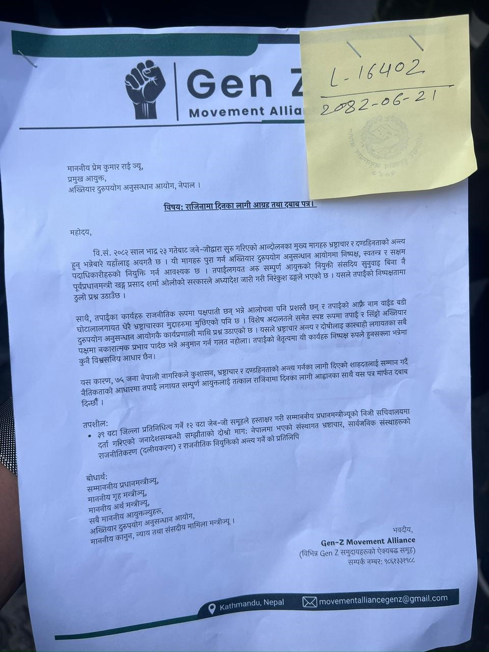 मंगलबार जेनजी समूहका प्रतिनिधिहरू टंगालस्थित अख्तियार कार्यालय पुगेका थिए र ज्ञापनपत्र दर्ता गराएका हुन्। ज्ञापनपत्रमा राईको राजीनामा माग गर्दै उक्त पत्र प्रधानमन्त्री कार्यालय र कानून मन्त्रालयमा पनि पठाइएको छ ।