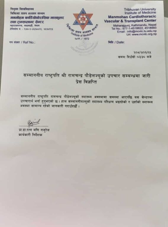 काठमाडौं । राष्ट्रपति रामचन्द्र पौडेलको स्वास्थ्यमा समस्या देखिएपछि शनिबार दिउँसो त्रिभुवन विश्वविद्यालय अन्तर्गत मनमोहन कार्डियोथोरासिक भास्कुलर तथा ट्रान्सप्लान्ट सेन्टर, महाराजगञ्जमा भर्ना गरिएको छ ।