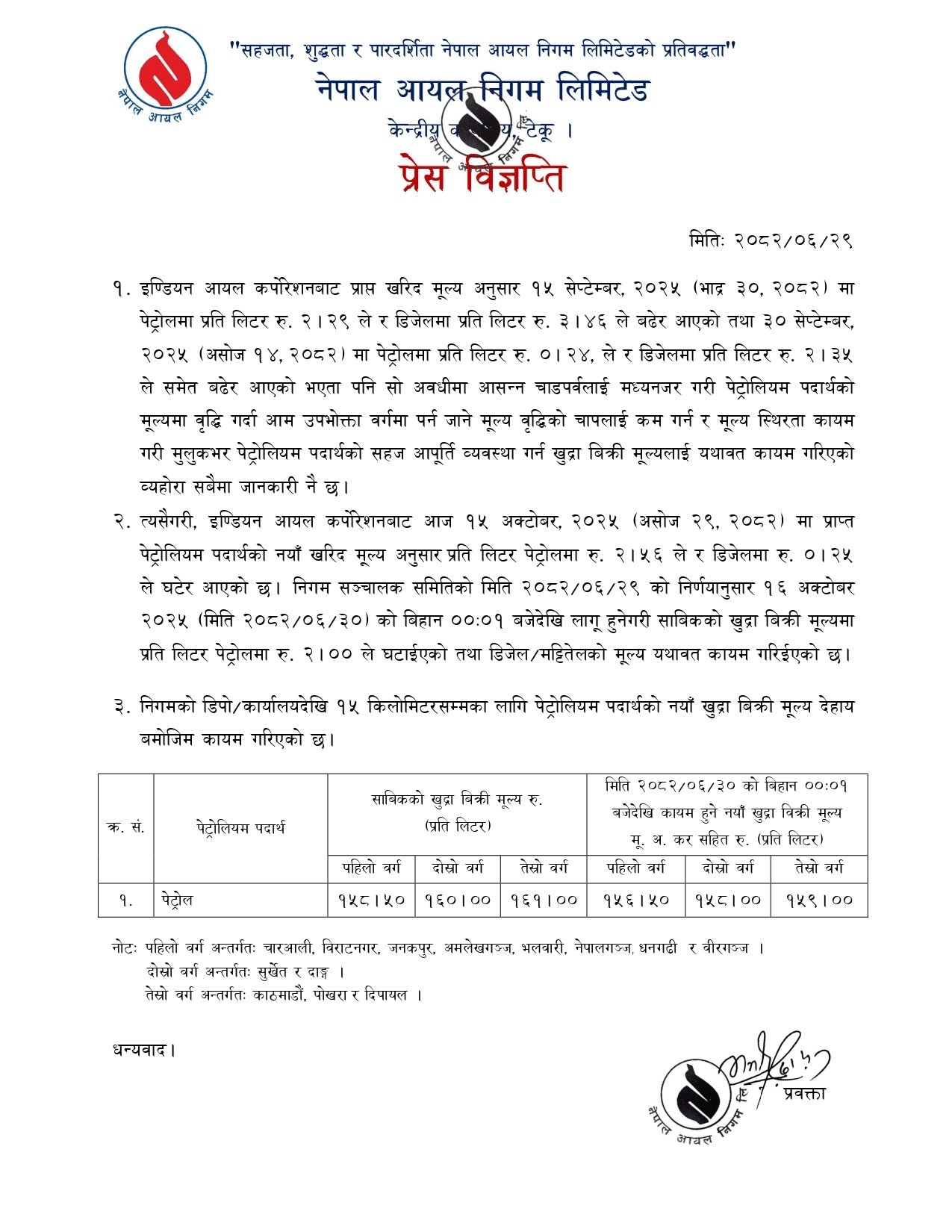 निगमका अनुसार काठमाडौँ उपत्यका, पोखरा र दिपायलमा पेट्रोल प्रतिलिटर १५९ रुपैयाँ, सुर्खेत र दाङमा १५८ रुपैयाँ तथा बाँकी क्षेत्रमा १५६.५० रुपैयाँ कायम भएको छ ।