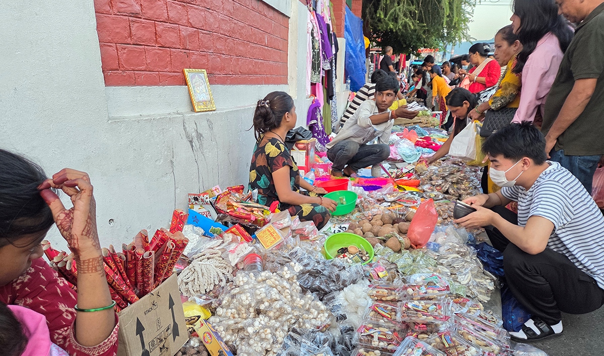 अहिले बजारका हरेक सडकपेटीमा सयौँ व्यापारी व्यस्त छन् । दियो, रङ, मिठाइ, किसमिस, पूजाका लागि माटाका पाला, बत्तीलगायत तिहारमा आवश्यक पर्ने सामग्री बिक्रीले बजार रङ, सुगन्ध र झिलिमिलीले भरिएको छ ।
