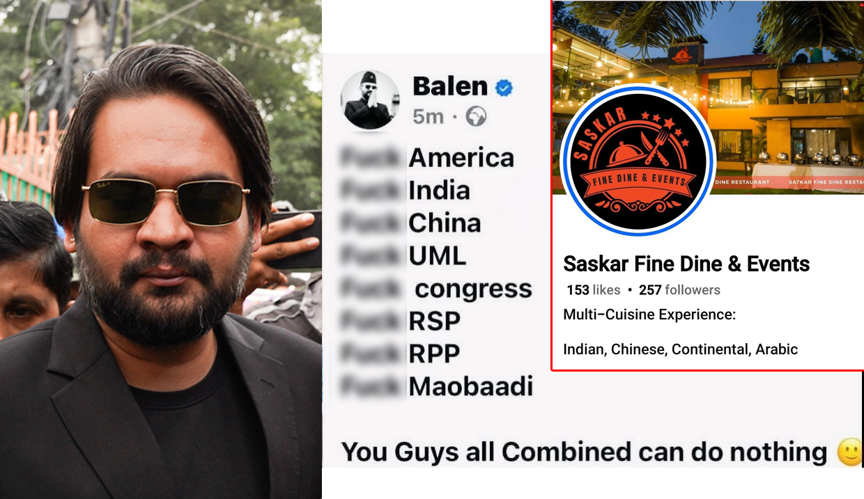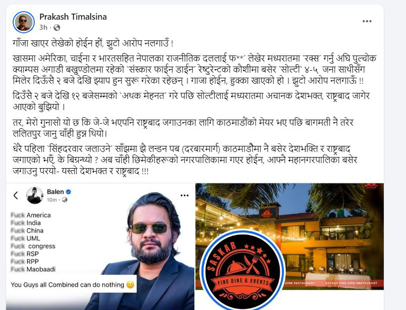 त्यस्तै पत्रकार प्रकाश तिम्सिनाले पनि कार्कीले जस्तै बालेन सो रेष्टुरेटमा दिउँसो देखि नै रहेको दावी गरेका छन् । उनले लेखेका छन् – “गाँजा खाएर लेखेको होईन हौं, झुटो आरोप नलगाउँ ! खासमा अमेरिका, चाईना र भारतसहित नेपालका राजनीतिक दललाई फ… लेखेर मध्यरातमा ‘रक्स’ गर्नु अघि पुल्चोक क्याम्पस अगाडी बखुण्डोलमा रहेको ‘संस्कार फाईन डाईन’ रेष्टुरेन्टको कौशीमा बसेर ‘सोल्टी’ ४÷५ जना साथीसँग मिलेर दिऊँसै २ बजे देखि झ्याप हुन सुरू गरेका रहेछन् । गाजा होईन, हुक्का खाएको हो । झुटो आरोप नलगाऊँ !! दिउँसै २ बजे देखि १२ बजेसम्मको ‘अथक मेहनत’ गरे पछि सोल्टीलाई मध्यरातमा अचानक देशभक्त, राष्ट्रबाद जागेर आएको बुझियो । तर, मेरो गुनासो यो छ कि जे–जे भएपनि राष्ट्रबाद जगाउनका लागि काठमाडौंको मेयर भए पछि बागमती नै तरेर ललितपुर जानु चाँही हुन्न थियो। धेरै पहिला ‘सिंहदरवार जलाउने’ साँझमा झै ‘लन्डन पब दरबारमार्ग’ काठमाडौैमा नै बसेर देशभक्ति र राष्ट्रबाद जगाएको भएँ, के बिग्रन्थ्यो ? अब चाँही छिमेकीहरूको नगरपालिकामा गएर होईन, आफ्नै महानगरपालिका बसेर जगाउनु परयो– यस्तो देशभक्त र राष्ट्रबाद !!!”