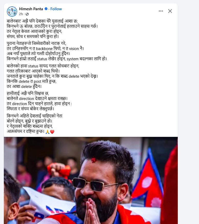 बालेनको हावा status सायद गलत सोचबाट होइन, गलत तरिकाबाट आएको शब्द थियो भन्दै पन्तले ‘अहिले देशलाई चाहिएको नेता बोल्ने होइन, बुझ्ने र बुझाउने हो । नेतृत्वको शक्ति शब्दमा होइन, आत्मसंयम र दृष्टिमा हुन्छ।’