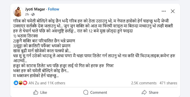 उनले लेखेकी छिन् “गरिबको चमेली बोल्दिने कोइ छैन भन्दै गरिबहरुको ठेला उठाउनु भो, म नेपाल हासेको हेर्न चाहन्छु भन्दै जेन्जी उक्साएर सर्लक्कै देश जलाउनु भो … जुन जुन शक्तिको आडमा फिल्मी स्टाइलमा बितन्ढा मच्चाउनु भो त्यही शक्तीहरुले थेचार्न थाले पछिको असन्तुष्टि छर्लङ्ग… रात को १२ बजे मुख छोड्दा हुने फाइदा