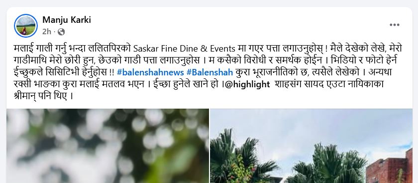 कार्कीले फेसवुकमा यो पोष्ट गरेपछि बालेनका समर्थकहरुले उनलाई गाली गरेका छन् । मेयर बालेनको लोकप्रियता देखेर विरोधीहरुले झुटो प्रचार गरेको भन्दै गालीगलौज गरेपछि पत्रकार कार्कीले सोही रेष्टुरेन्टमा आफू गएको पोष्ट, आफ्नो र वालेनको गाडीको तस्बिर राख्दै थप प्रष्ट पार्दै अर्को पोष्टमा लेखेकी छिन् “मलाई गाली गर्नु भन्दा ललितपुरको Saskar Fine Dine & Events मा गएर पत्ता लगाउनुहोस् ! मैले देखेको लेखे, मेरो गाडीमाथि मेरो छोरी हुन, छेउको गाडी पत्ता लगाउनुहोस । म कसैको विरोधी र समर्थक होईन । भिडियो र फोटो हेर्न ईच्छुकले सिसिटिभी हेर्नुहोस ! #balenshahnews #Balenshah कुरा भूराजनीतिको छ, त्यसैले लेखेको । अन्यथा रक्सी भाङका कुरा मलाई मतलव भएन । ईच्छा हुनेले खाने हो । @highlight शाहसंग सायद एउटा नायिकाका श्रीमान् पनि थिए ।”