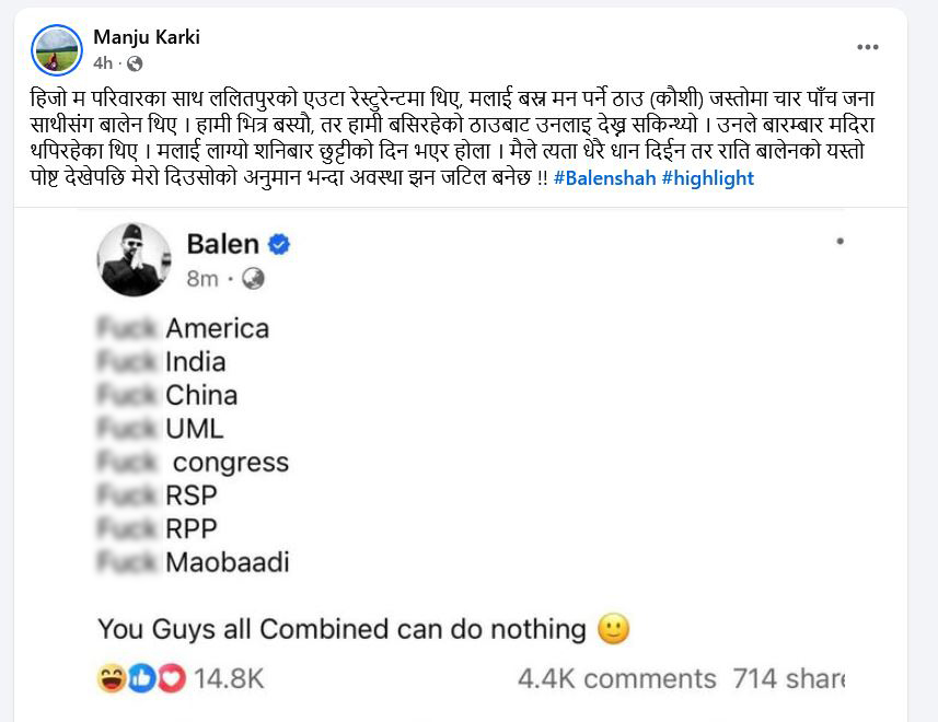 कार्कीले आज विहान लेखेकी छिन् “हिजो म परिवारका साथ ललितपुरको एउटा रेस्टुरेन्टमा थिए, मलाई बस्न मन पर्ने ठाउ (कौशी) जस्तोमा चार पाँच जना साथीसंग बालेन थिए । हामी भित्र बस्यौ, तर हामी बसिरहेको ठाउबाट उनलाई देख्न सकिन्थ्यो । उनले बारम्बार मदिरा थपिरहेका थिए । मलाई लाग्यो शनिबार छुट्टीको दिन भएर होला । मैले त्यता धेरै ध्यान दिईन तर राति बालेनको यस्तो पोष्ट देखेपछि मेरो दिउसोको अनुमानभन्दा अवस्था झन जटिल बनेछ !”