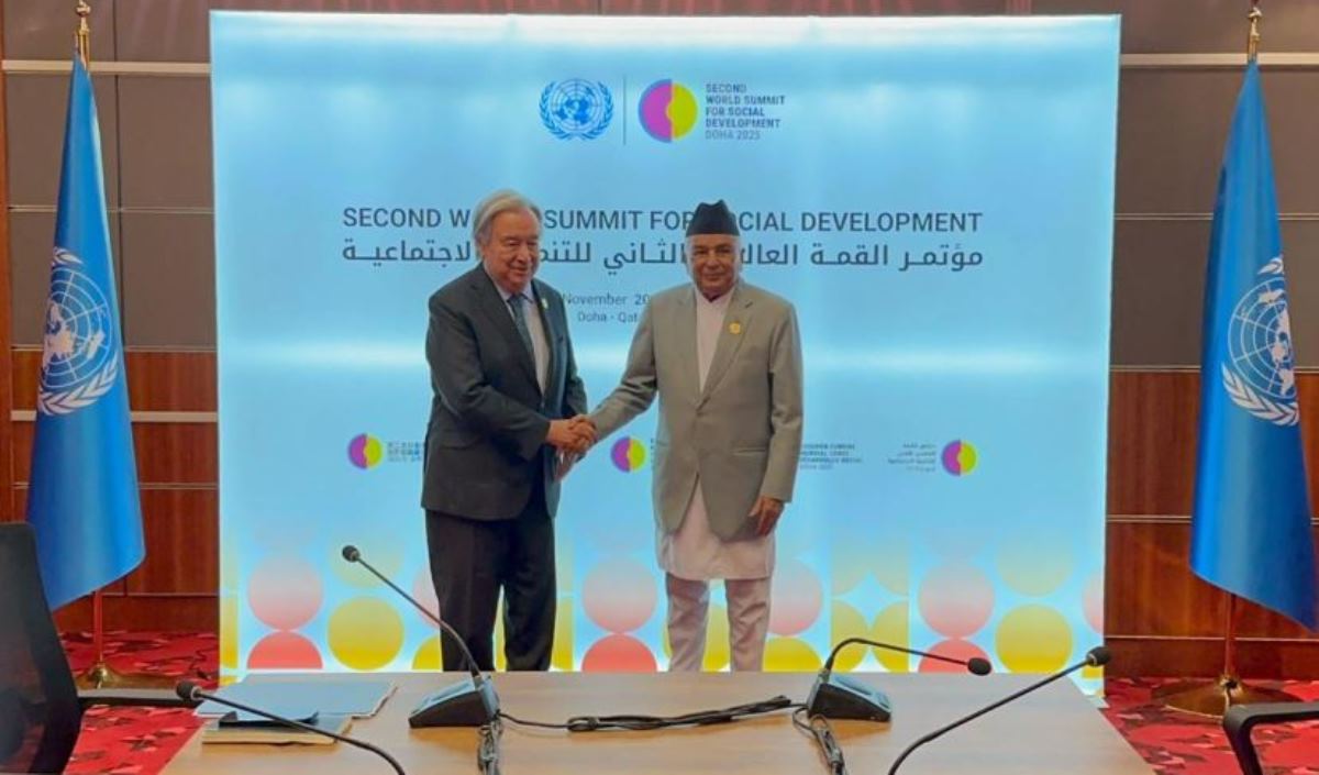 काठमाडौँ । ‘सामाजिक विकासका लागि दोस्रो विश्व शिखर सम्मेलन’मा सहभागी हुने सिलसिलामा कतारको राजधानी दोहामा रहेका राष्ट्रपति रामचन्द्र पौडेलसँग संयुक्त राष्ट्रसङ्घका महासचिव एन्टोनियो गुटेरेसले आज शिष्टाचार भेट गरेका छन्।