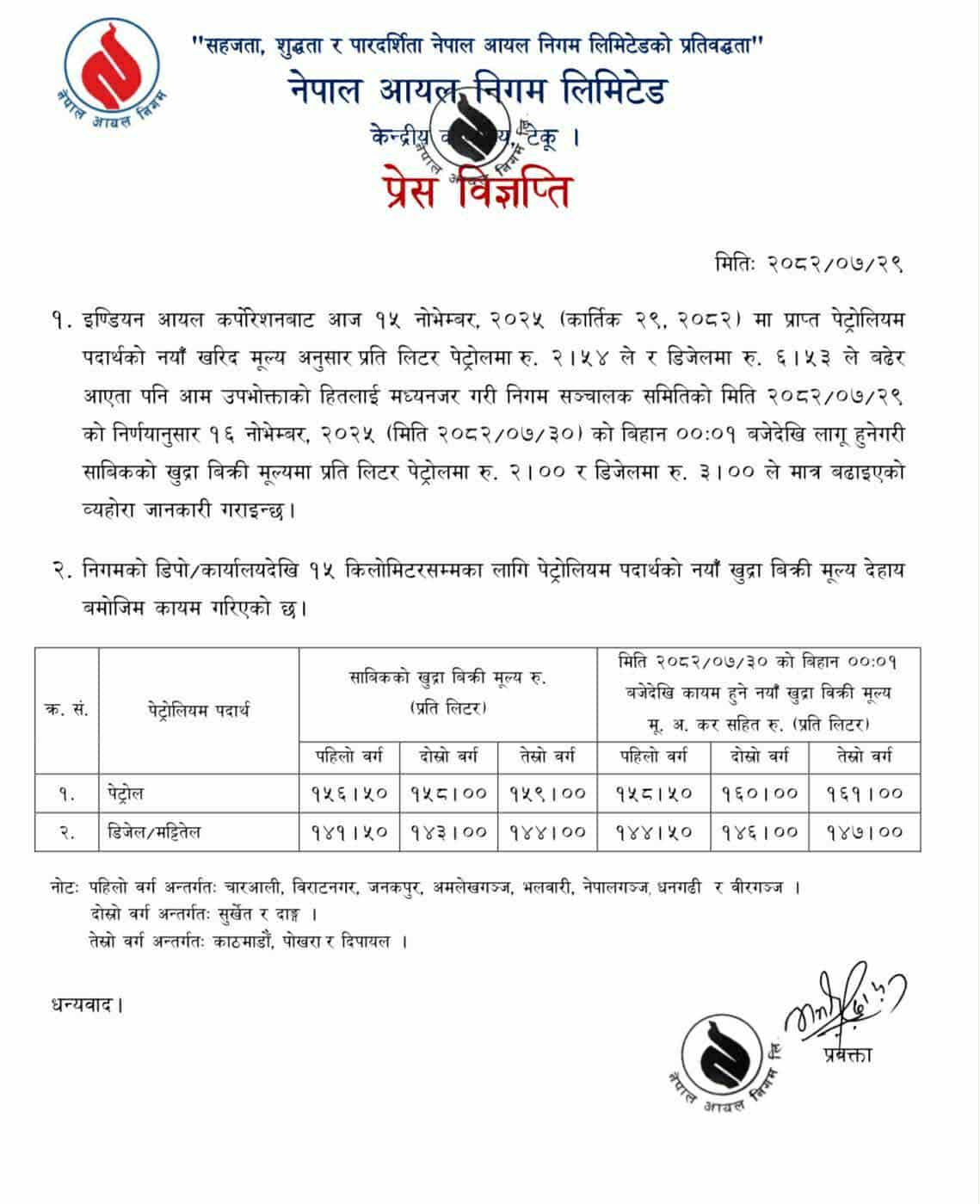 काठमाडौं । पेट्रोलियम पदार्थको मूल्य वृद्धि भएको छ। नेपाल आयल निगमले पेट्रोल र डिजेलको मृल्य वृद्धि गरेको हो। भारतबाट मूल्य बढेर आएपछि निगमले पेट्रोलमा प्रतिलिटर २ रुपैयाँ र डिजेल/मट्टितेलमा प्रतिलिटर ३ रुपैयाँ बढाएको जानकारी दिएको छ।