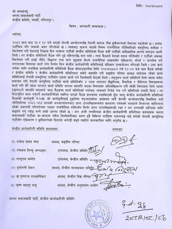 उनीहरूले आइतबार संयुक्त विज्ञप्ति जारी गरेर नेकपा एकताका सन्दर्भमा कार्यकारिणी बैठक नबोलाएको भन्दै पार्टीबाट राजीनाम दिएर कात्तिक १९ गते ब नेको दलमा समाहित हुने निर्णय गर्न पुगेको बताएका छन् ।