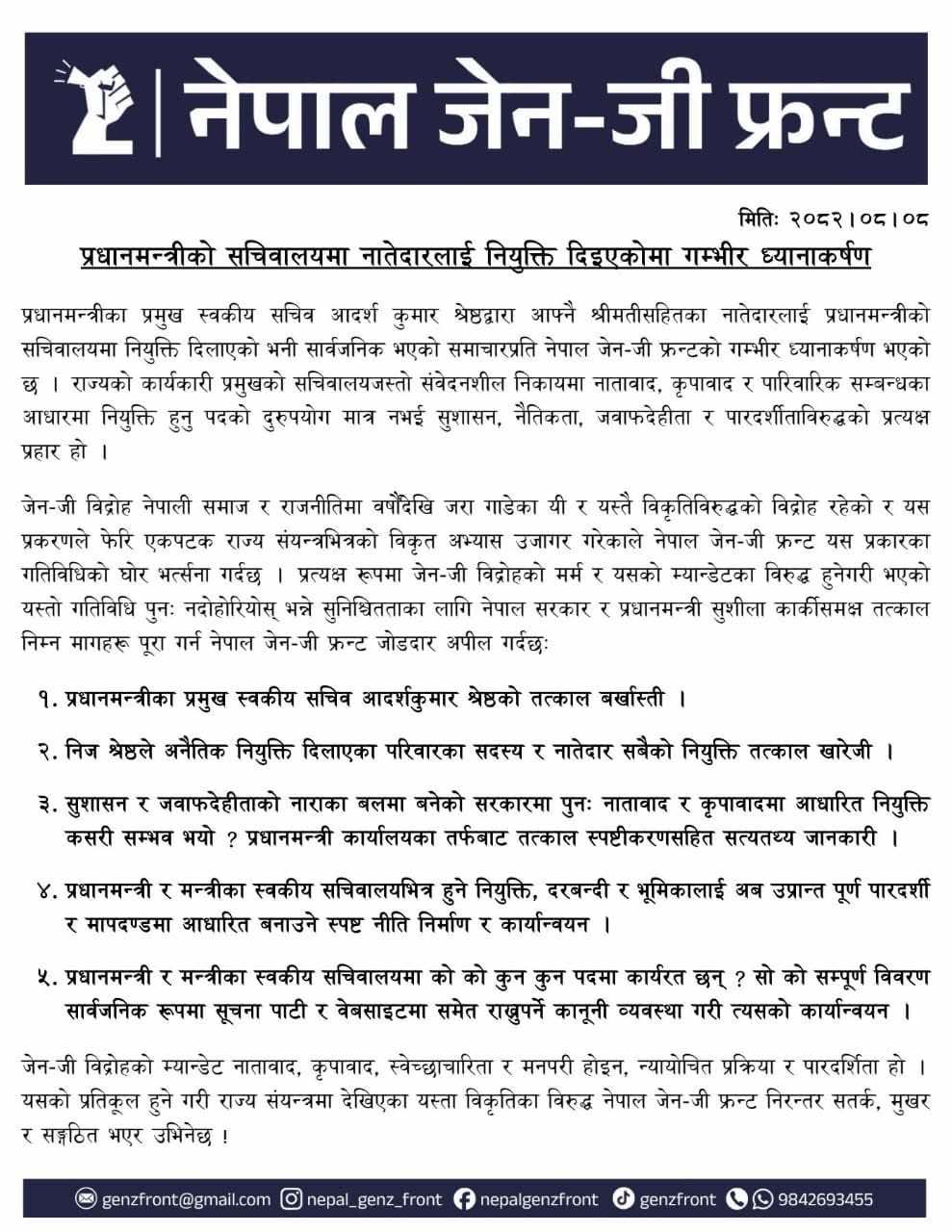 सोमबार जारी विज्ञप्तिमा फ्रन्टले राज्यको कार्यकारी प्रमुखको सचिवालयजस्ता संवेदनशील संयन्त्रमा नातावाद र कृपावादका आधारमा गरिएको नियुक्ति सुशासन, नैतिकता, जवाफदेहिता र पारदर्शितामाथिको ठाडो प्रहार भएको टिप्पणी गरेको छ। फ्रन्टका अनुसार जेन–जी विद्रोह नै यस्ता दीर्घकालीन राजनीतिक–प्रशासनिक विकृतिविरुद्ध उठेको आन्दोलन भएकोले हालको प्रकरणले पुनः राज्य संयन्त्रभित्रको विकृति उजागर गरेको छ।
