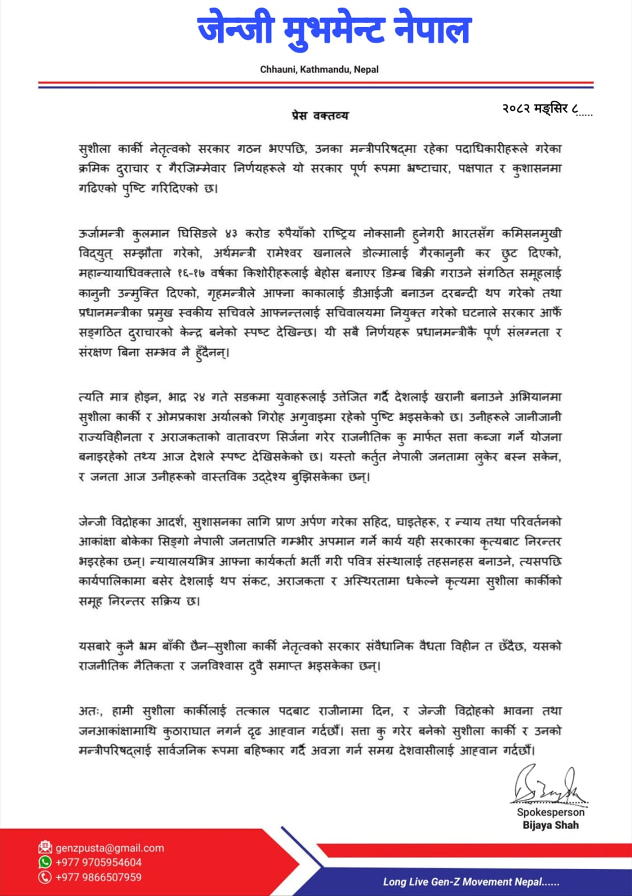 प्रवक्ता विजय शाहीद्वारा जारी विज्ञप्तिमा यी सबै कार्य ‘प्रधानमन्त्रीको प्रत्यक्ष संलग्नता वा संरक्षणबिना सम्भव नहुने’ उल्लेख गर्दै प्रधानमन्त्री कार्कीको तत्काल राजीनामा मागिएको छ।