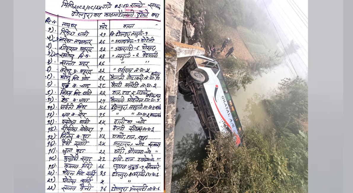 दाङ । डडेल्धुराबाट काठमाडौँतर्फ गइरहेको ना ८ ख ७४५५ नम्बरको यात्रुबस दाङको लमही नगरपालिका–१ स्थित कौडियापुलबाट खोलामा खस्दा २२ जना यात्री घाइते भएका छन्। दुर्घटना आज बिहान करिब ३ बजे भएको हो।