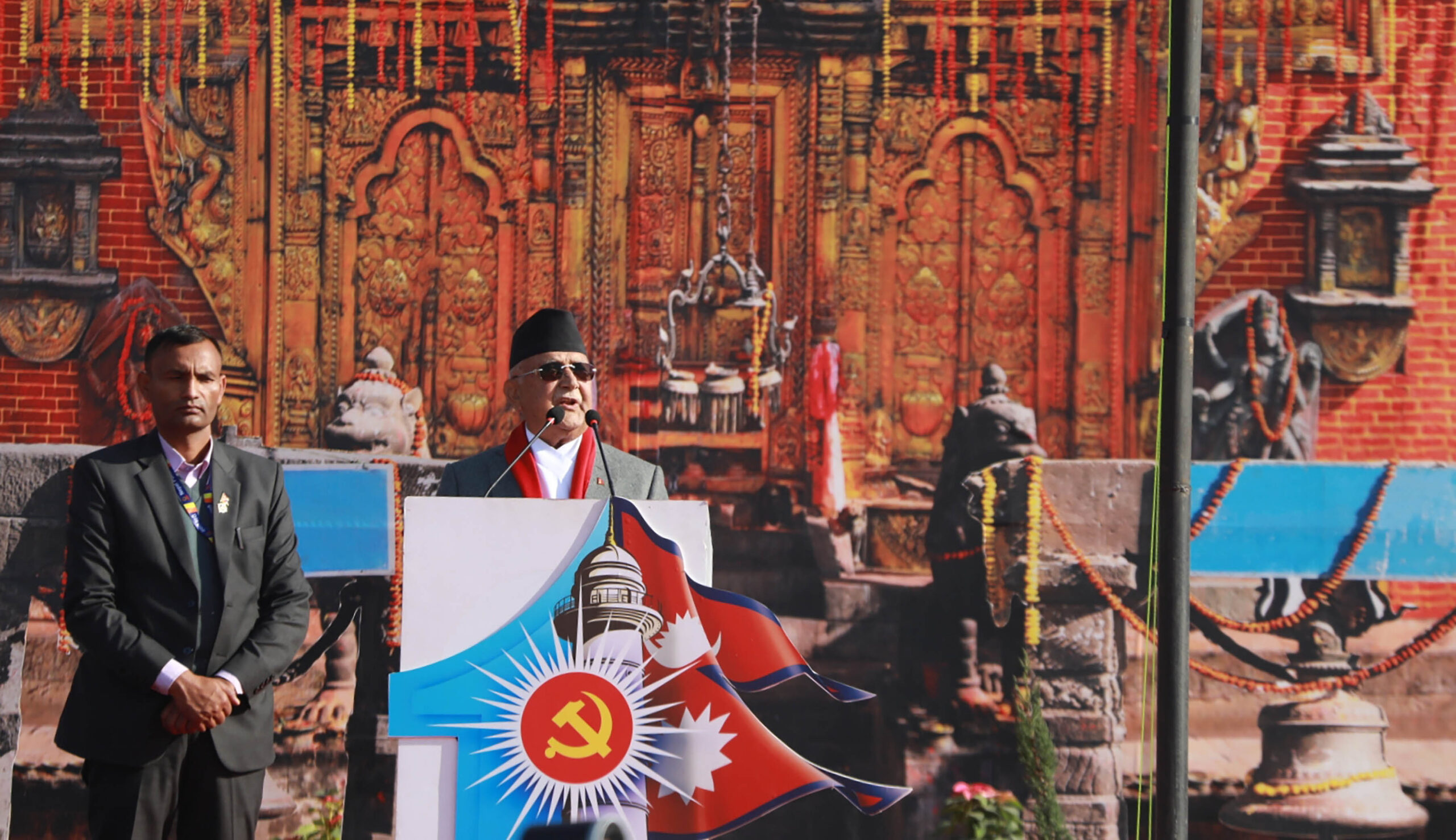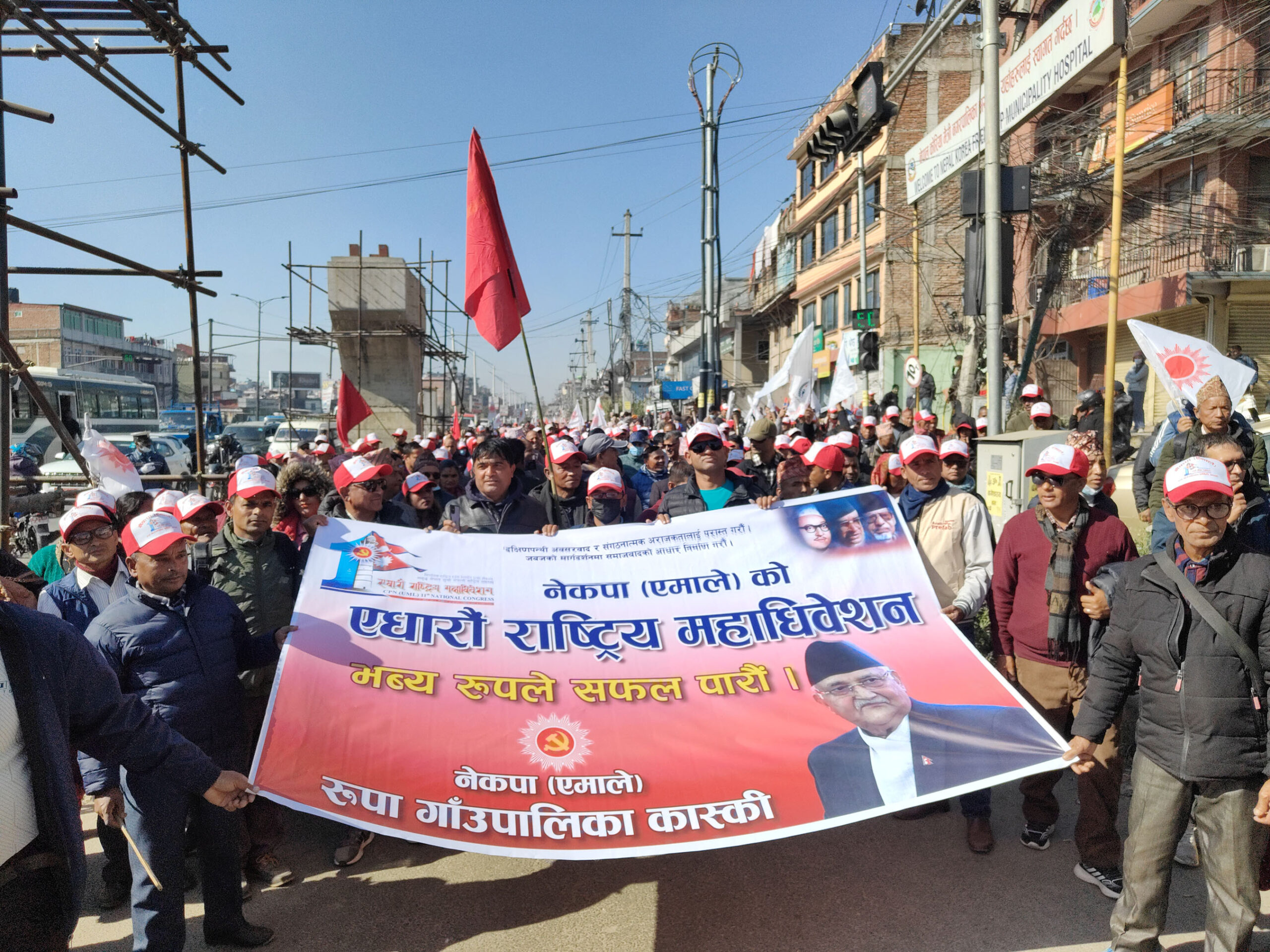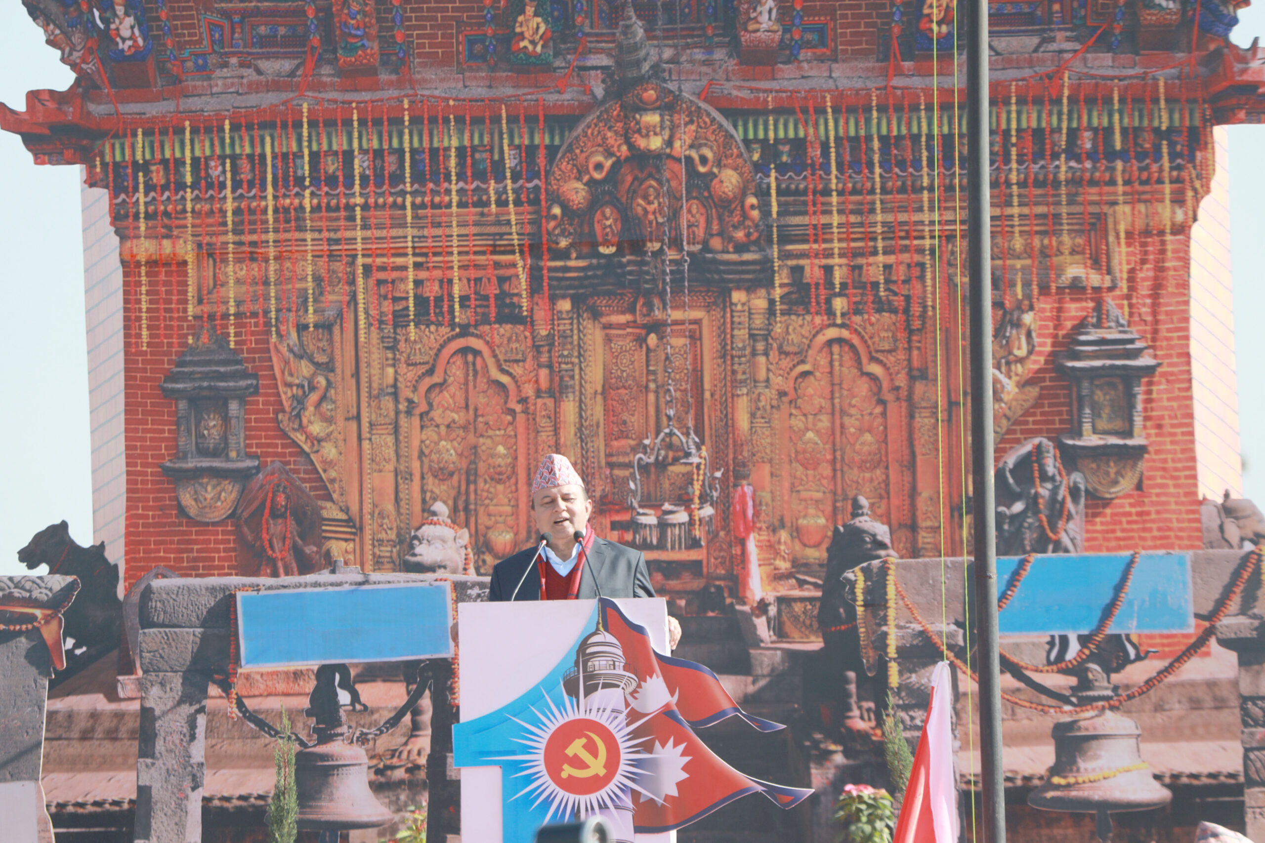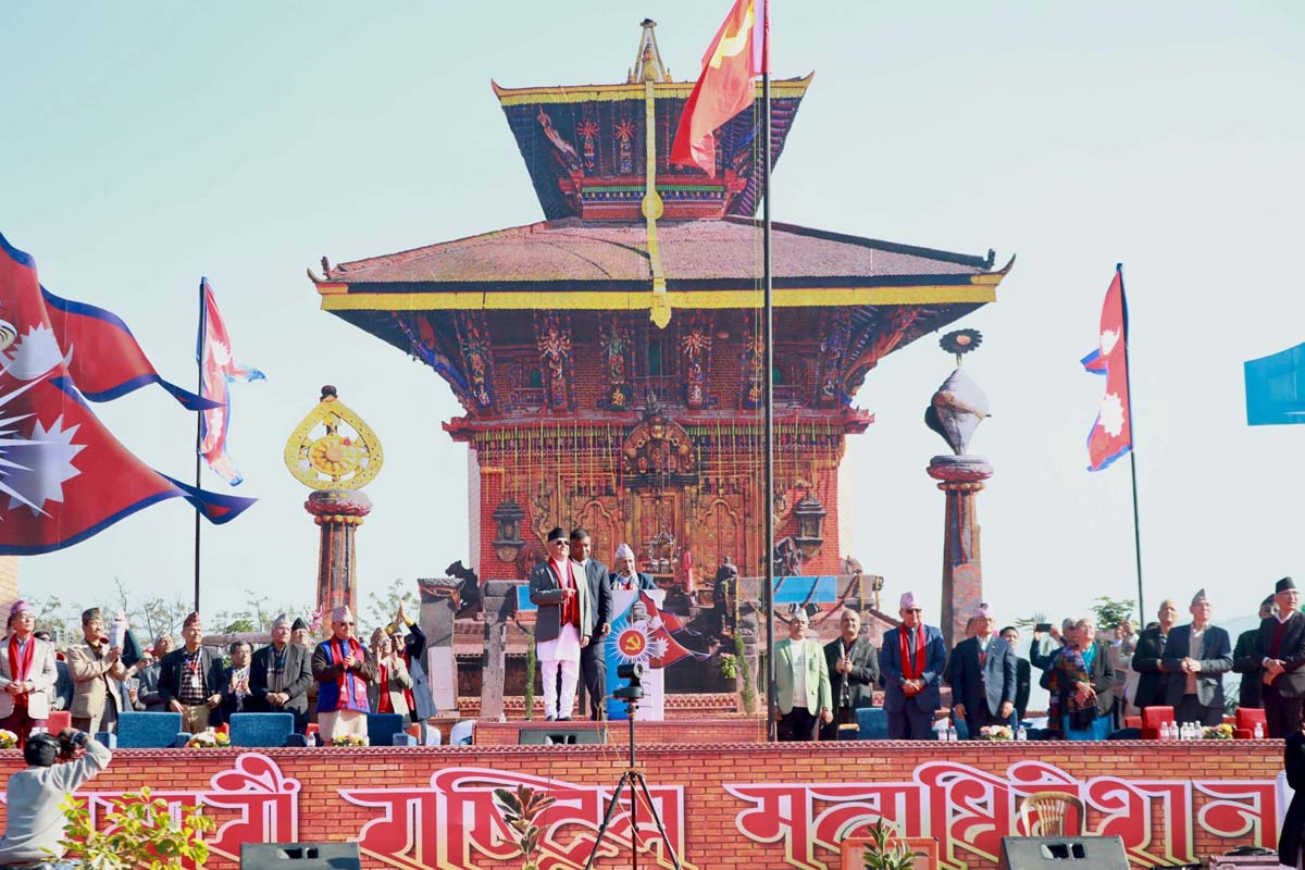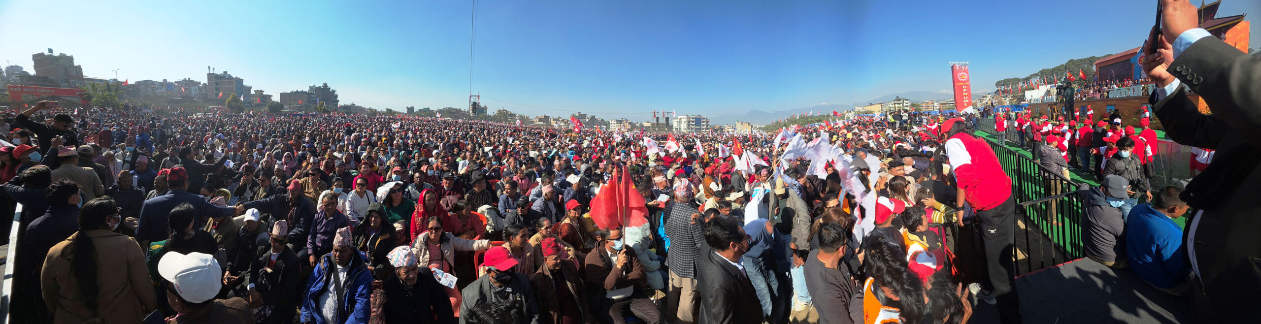 भक्तपुरको सल्लाघारीस्थित चौरमा शनिबार भएको नेकपा एमालेको ११ औं राष्ट्रिय महाधिवेशनको उद्घाटन कार्यक्रम र सहभागि जनसमुदाय । नेपाल ट्रष्टको १०८ रोपनी चौरमा सहभागिहरुले भरिएको थियो । कार्यक्रममा लाखौको उपस्थिति थियो । तस्विर : रमेश गिरी, रासस