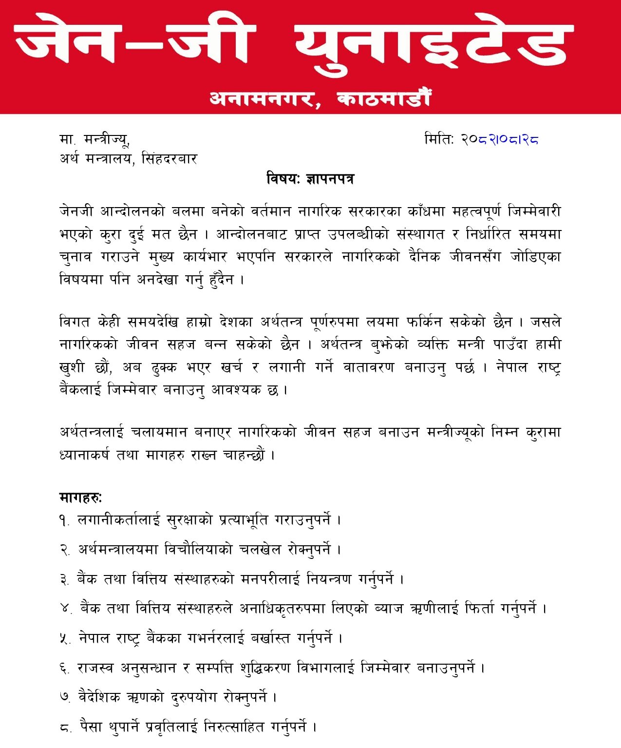यसका साथै, ज्ञापनपत्रमा अर्थ मन्त्रालयमा हुने विचौलियाको चलखेल रोक्नुपर्ने, बैंक तथा वित्तीय संस्थाको मनपरी नियन्त्रण गर्नुपर्ने, अनाधिकृत रूपमा असुल गरिएको ब्याज ऋणीलाई फिर्ता गराउनुपर्ने, गभर्नरलाई बर्खास्त गर्नुपर्ने, राजस्व अनुसन्धान तथा सम्पत्ति शुद्धिकरण विभागलाई प्रभावकारी र जिम्मेवार बनाउनुपर्ने तथा वैदेशिक ऋणको दुरुपयोग रोक्नुपर्ने लगायतका मागहरू समेटिएका छन्।