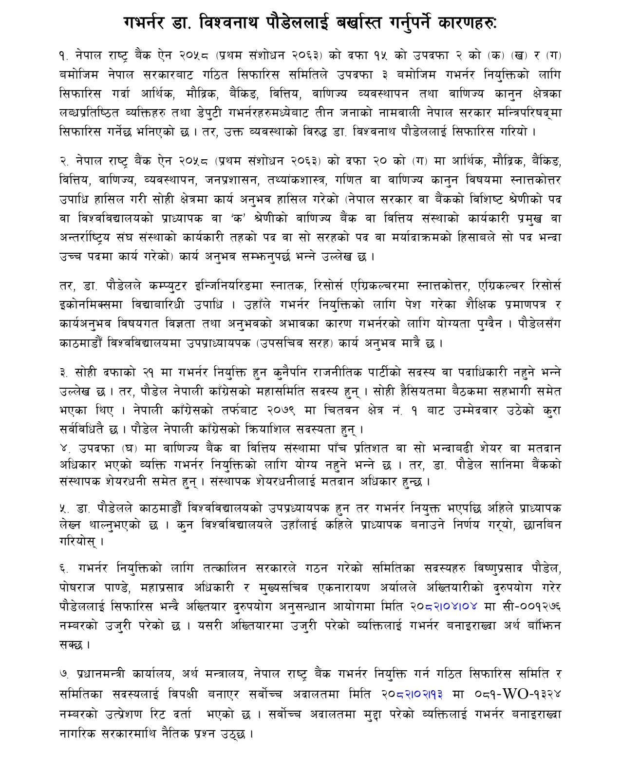 ज्ञापनपत्रमा नेपाल राष्ट्र बैंक ऐनको उल्लङ्घन गर्दै तत्कालीन सरकारले स्वार्थ समूहको डिजाइनअनुसार डा. पौडेललाई गभर्नर नियुक्त गरेको आरोप लगाइएको छ। साथै, सरकारले गठन गरेको सिफारिस समितिले आफ्नो अधिकार दुरुपयोग गरी उनलाई सिफारिस गरेको दाबी गर्दै ऐनअनुसार नयाँ गभर्नर नियुक्त गर्न माग गरिएको छ।