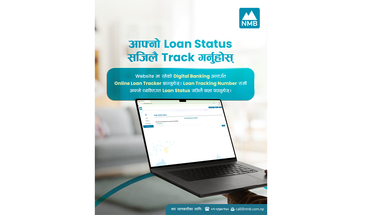 बैंकमा कर्जाका लागि आवश्यक कागजातहरू पेश गरेपश्चात् ग्राहकले एउटा ‘ट्र्याकिङ नम्बर’ प्राप्त गर्नेछन् । सो नम्बर प्रयोग गरी ग्राहकहरूले बैंकको वेबसाइटमा गई डिजिटल बैंकिङ (Digital Banking) खण्डमा गएर र अनलाइन कर्जा ट्र्याकिङ (Online Loan Tracker) चयन गरी वा सिधै https://digi.nmb.com.np/loan-tracker मा गएर पनि आफ्नो कर्जा प्रक्रिया कहाँ पुग्यो भन्ने जानकारी लिन सक्नेछन् ।