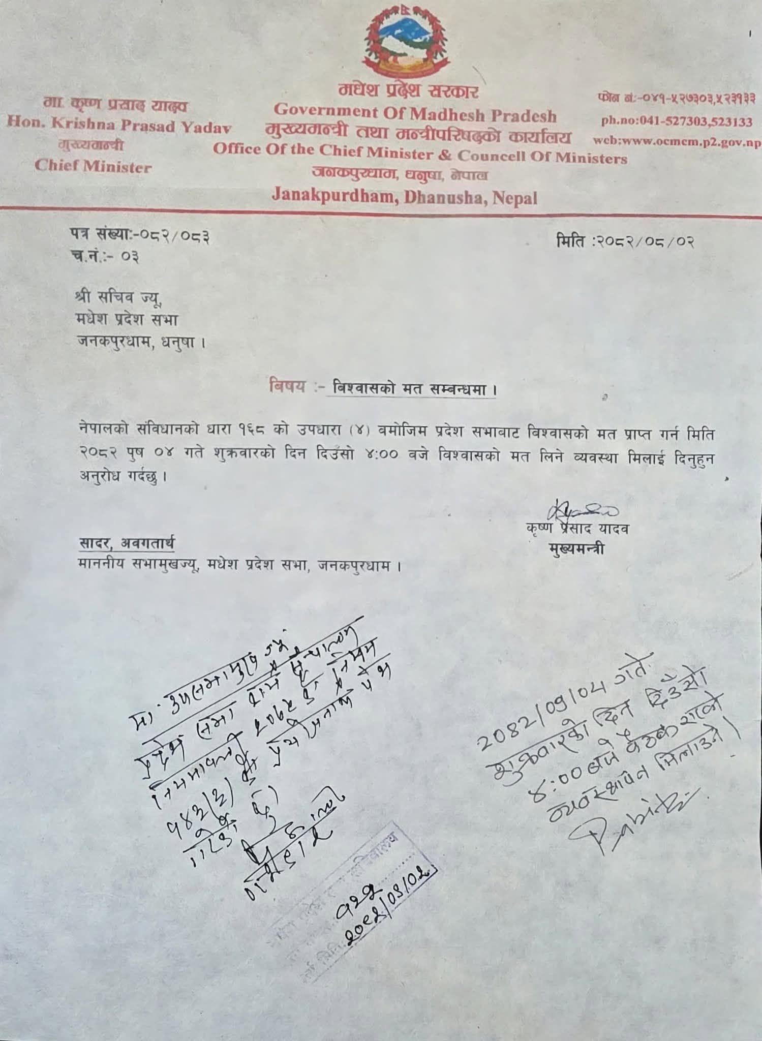 मुख्यमन्त्री यादवले बुधबार प्रदेश सभा सचिवालयलाई पत्र पठाउँदै विश्वासको मत लिने व्यवस्था मिलाइदिन अनुरोध गरेका छन्। उनले पठाएको पत्रमा संविधानको धारा १६८ को उपधारा (४) अनुसार २०८२ पुस ४ गते शुक्रबार दिउँसो ४ बजे प्रदेश सभाबाट विश्वासको मत लिने व्यवस्था मिलाइदिन आग्रह गरिएको उल्लेख छ।