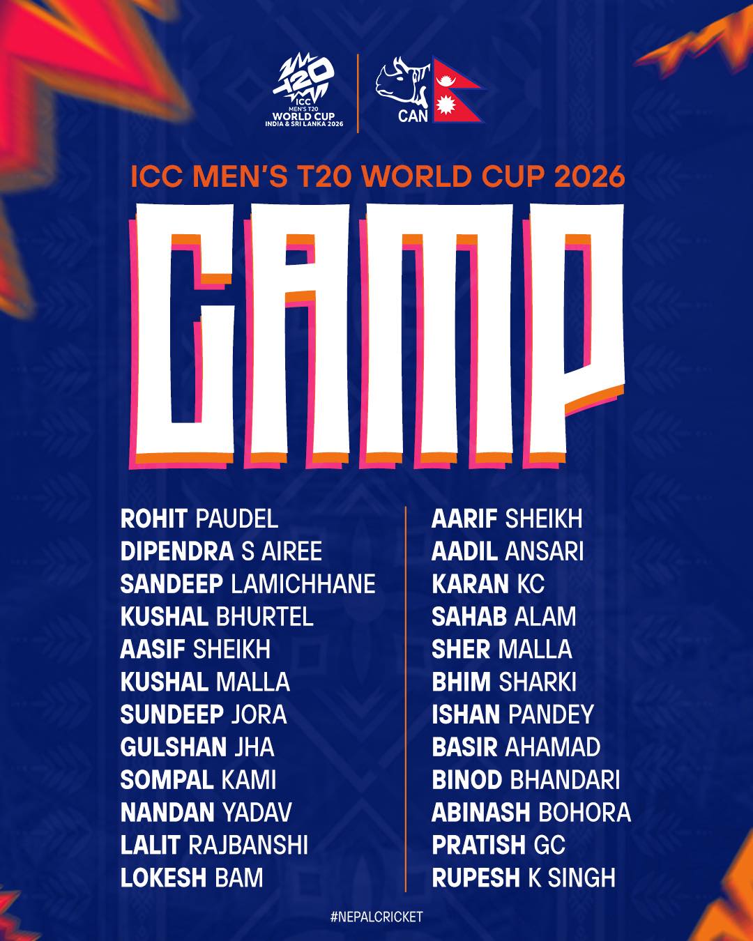 काठमाडौं । आगामी वर्ष भारत र श्रीलंकामा आयोजना हुने आईसीसी टी–२० विश्वकपका लागि नेपालको प्रारम्भिक राष्ट्रिय टोली घोषणा भएको छ। नेपाल क्रिकेट संघ (क्यान)ले आइतबार पहिलो चरणको बन्द प्रशिक्षणका लागि २४ खेलाडीलाई बोलाएको हो।