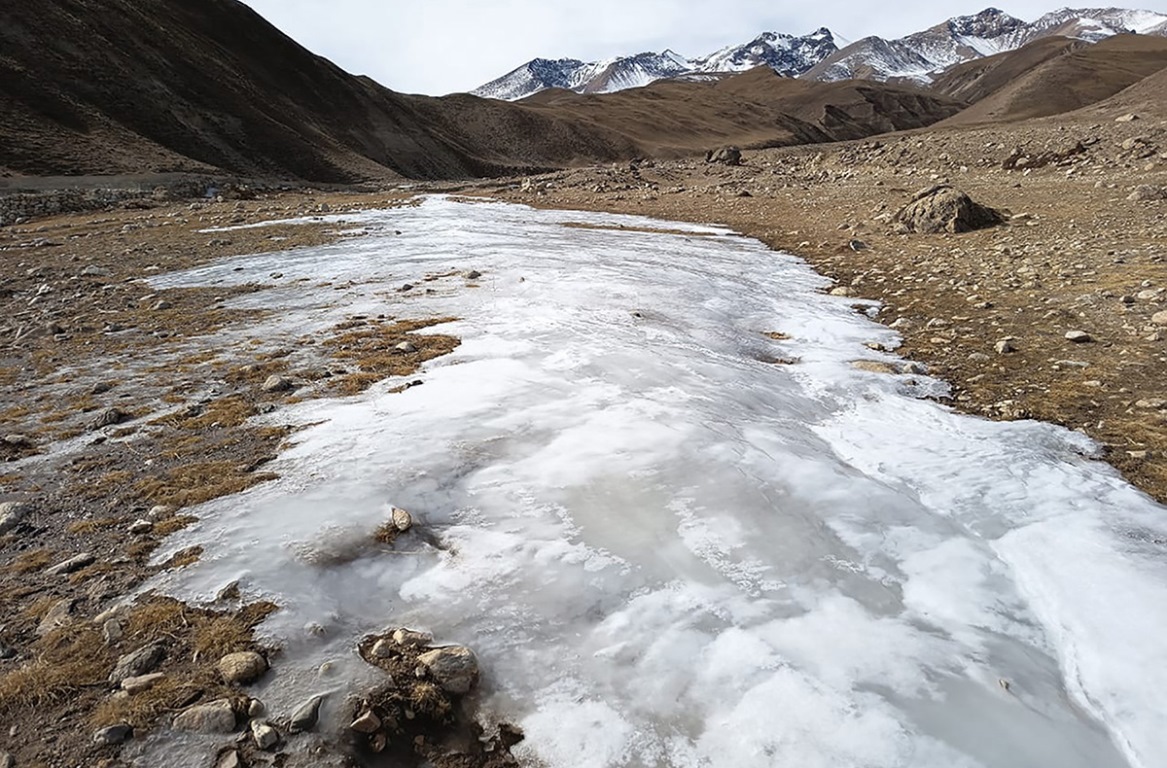 माथिल्लो मुस्ताङको लोमान्थाङ गाउँपालिका–३ ठिंगरमा चिसोले बरफ बनेर जमेको ठिंगर खोला । हिउँदयामको अत्यधिक चिसोका कारण नदीनाला, सिँचाइ कुलो, धारालगायत चिसोले जम्न थालेपछि स्थानीयको जनजीवन समेत प्रभावित बनेको छ । उपल्लो मुस्ताङमा बिहान र बेलुकीको समय तापक्रम माइनस २० डिग्री सेल्सियसमा झर्ने गरेको छ । तस्बिर : सुन्दरकुमार थकाली/रासस