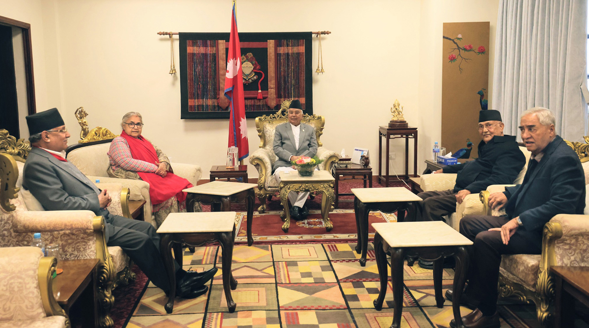 काठमाडौं । राष्ट्रपति रामचन्द्र पौडेलको पहलमा शीतल निवासमा प्रधानमन्त्रीसहित प्रमुख तीन दलका शीर्ष नेताबीच भेटवार्ता जारी छ ।