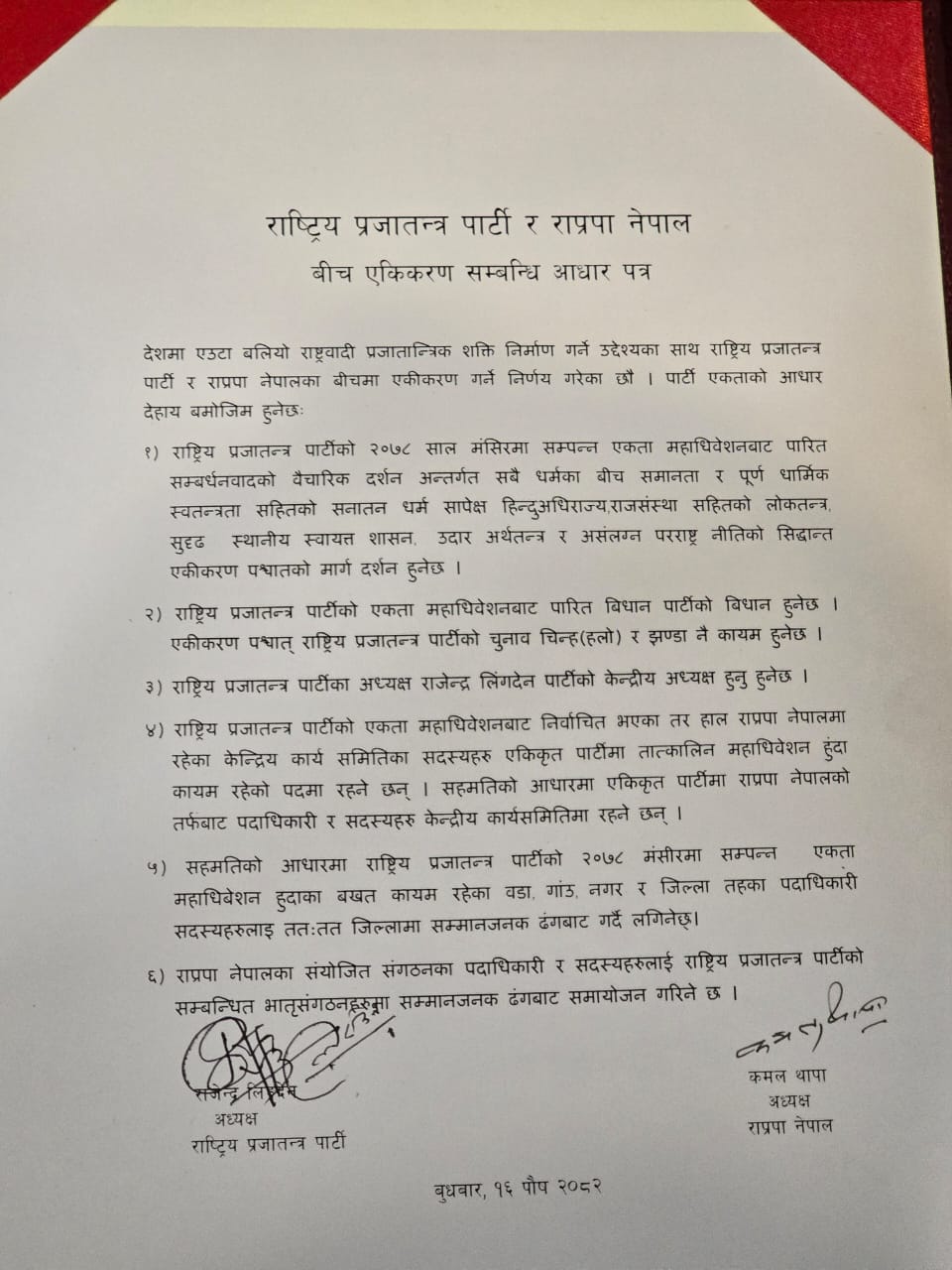 बुधबार राष्ट्रिय सभा गृहमा आयोजित एकता घोषणा कार्यक्रममा दुवै पार्टीका अध्यक्ष राजेन्द्र लिङदेन र कमल थापाले संयुक्त रूपमा एकता घोषणापत्र सार्वजनिक गरेका हुन्।
