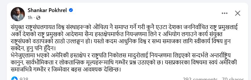 सामाजिक सञ्जालमार्फत पोखरेलले अमेरिकाले भेनेजुएलामा हवाई आक्रमण गरी राष्ट्रपति निकोलस मादुरो र उनकी पत्नीलाई नियन्त्रणमा लिएर अमेरिका लगेको घटनाप्रति आपत्ति जनाएका छन्। मादुरोलाई नियन्त्रणमा लिएपछि अमेरिकी राष्ट्रपति डोनाल्ड ट्रम्प प्रशासनले भेनेजुएलाका उपराष्ट्रपति रोड्रिगेजलाई अन्तरिम राष्ट्रपति घोषणा गरेको जनाइएको छ।