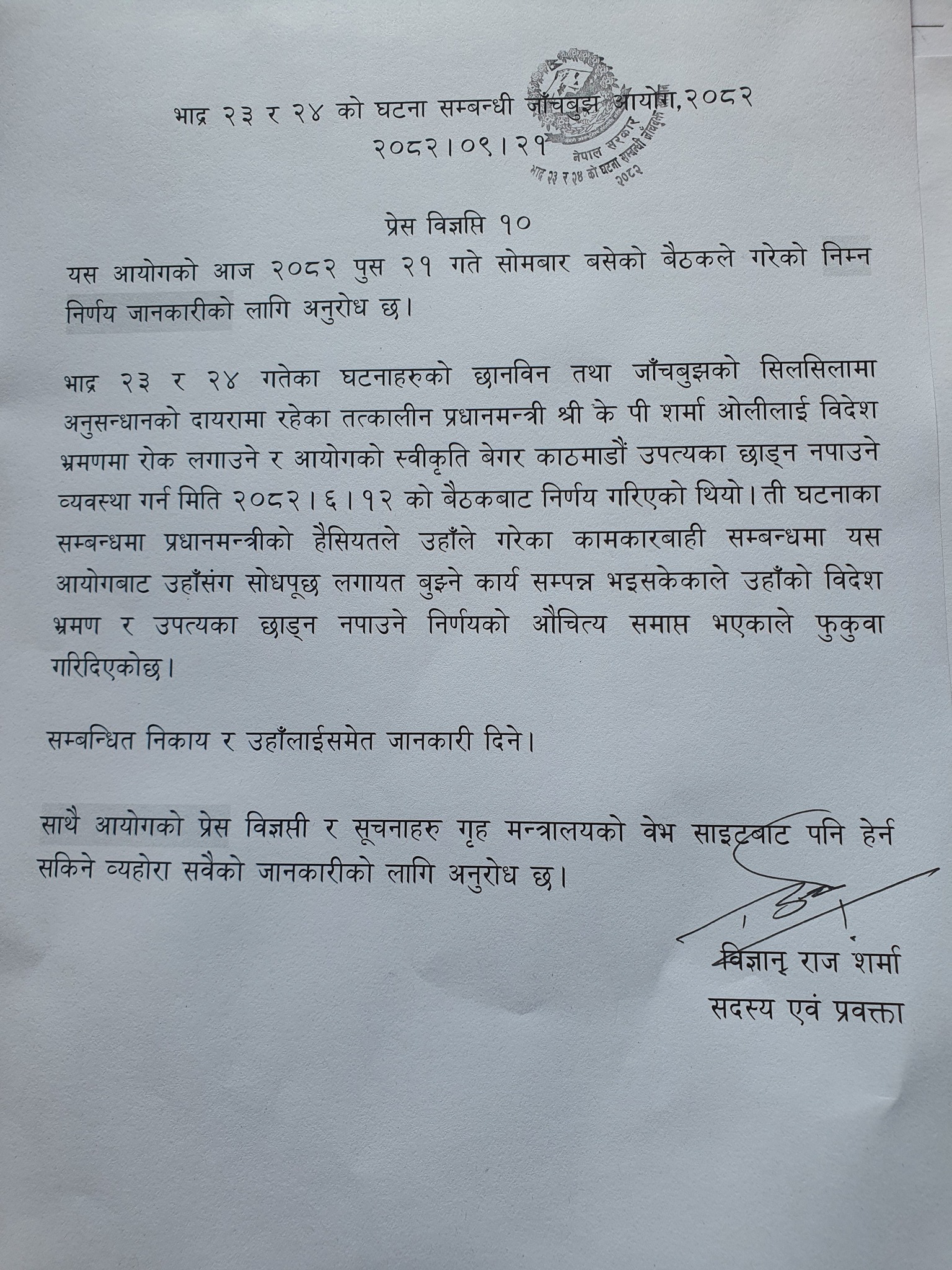 आयोगका प्रवक्ता विज्ञानराज शर्माद्वारा जारी विज्ञप्तिमा भदौ २३–२४ का घटनाको छानबिनका क्रममा तत्कालीन प्रधानमन्त्री ओलीलाई विदेश भ्रमणमा रोक लगाउने र अनुमतिबिना काठमाडौं उपत्यका बाहिर जान नपाउने गरी असोज १२ गते निर्णय गरिएको उल्लेख छ। तर आवश्यक सोधपुछ तथा बुझ्ने कार्य पूरा भइसकेकाले अब उक्त निर्णयको औचित्य समाप्त भएको भन्दै बन्देज फुकुवा गरिएको विज्ञप्तिमा जनाइएको छ।