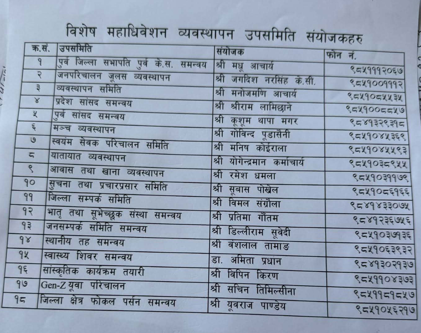 गठित उपसमितिहरूमा व्यवस्थापन, जनपरिचालन, मञ्च व्यवस्थापन, आवास तथा खाना व्यवस्था, ‘जेन–जी’ युवा परिचालनलगायत विषयगत समिति रहेका छन् ।