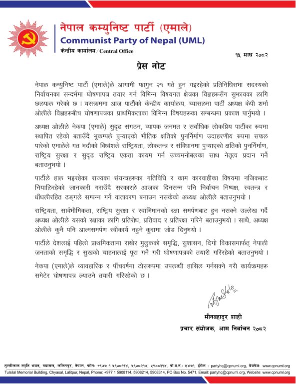 काठमाडौं । नेपाल कम्युनिष्ट पार्टी (एमाले) ले आगामी फागुन २१ गते हुन गइरहेको प्रतिनिधिसभा सदस्य निर्वाचनका लागि घोषणापत्र तयारीका क्रममा विभिन्न विषयगत क्षेत्रका विज्ञहरूसँग छलफल गरेको छ।