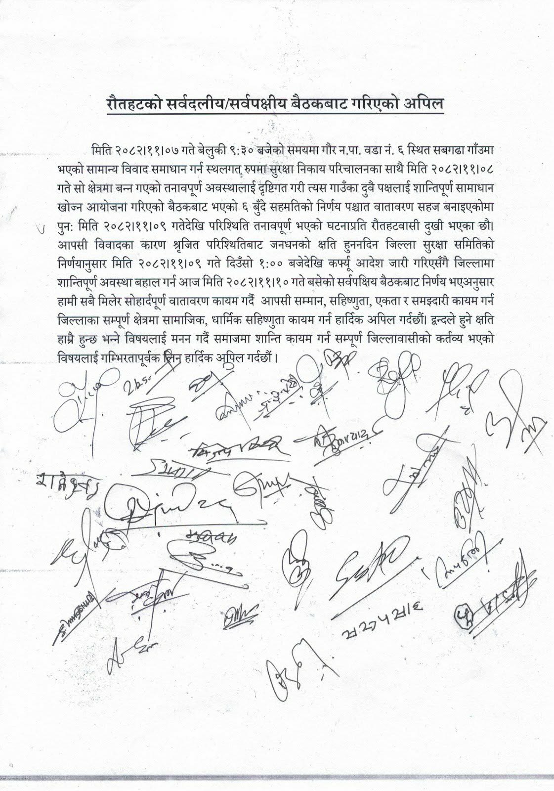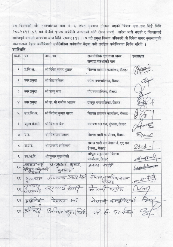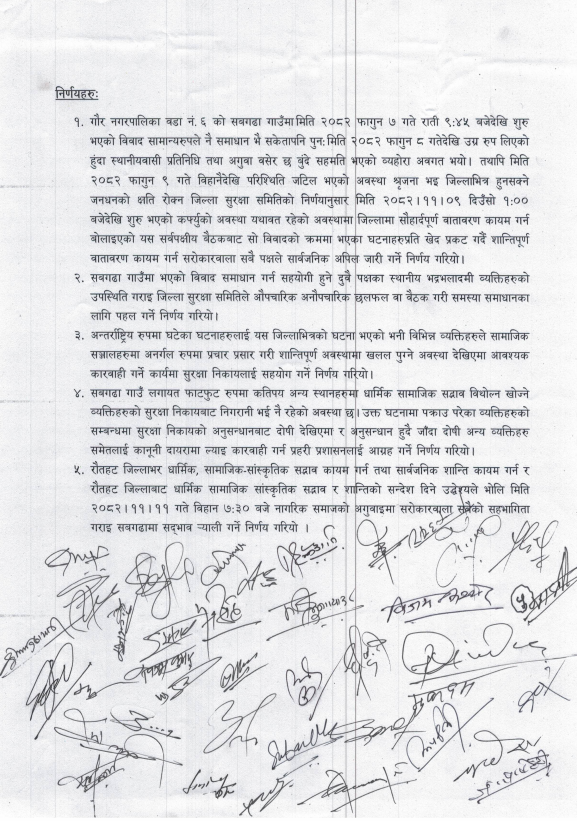 १. गौर नगरपालिका वडा नं. ६ को सबगढा गाउँमा मिति २०८२ फागुन ७ गते राति ९:४५ बजे सुरु भएको विवाद सामान्य रूपले नै समाधान भइसके तापनि पुनः मिति २०८२ फागुन ८ गतेदेखि उग्र रूप लिएको हुँदा स्थानीयवासी प्रतिनिधि तथा अगुवा बसेर छबुँदे सहमति भएको बेहोरा अवगत भयो। तथापि मिति २०८२ फागुन ९ गते बिहानैदेखि परिस्थिति जटिल भएको अवस्था सिर्जना भई जिल्लाभित्र हुनसक्ने जनधनको क्षति रोक्न जिल्ला सुरक्षा समितिको निर्णयानुसार मिति २०८२।११।०९ दिउँसो १:०० बजेदेखि सुरु भएको कर्फ्युको अवस्था यथावत् रहेको अवस्थामा जिल्लामा सौहार्दपूर्ण वातावरण कायम गर्न बोलाइएको यस सर्वपक्षीय बैठकबाट सो विवादको क्रममा भएका घटनाहरूप्रति खेद प्रकट गर्दै शान्तिपूर्ण वातावरण कायम गर्न सरोकारवाला सबै पक्षले सार्वजनिक अपिल जारी गर्ने निर्णय गरियो।