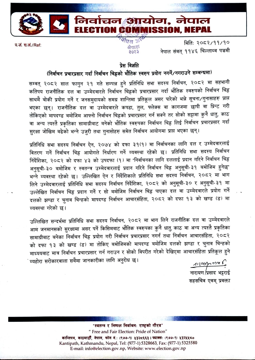 आयोगका अनुसार राजनीतिक दल वा उम्मेदवारले कपडा, तुल, फ्लेक्स वा कागजमा छापी वा प्रिन्ट गरी तोकिएको मापदण्ड बमोजिम आफ्नो निर्वाचन चिह्नको प्रचारप्रसार गर्न सक्ने छन्। सोको सट्टामा कुनै धातु, काठ वा अन्य त्यस्तै प्रकृतिका सामाग्रीबाट बनेको भौतिक स्वरूपका निर्वाचन चिह्न लिई निर्वाचन प्रचारप्रसार गर्दा सुरक्षा जोखिम बढेको उजुरी तथा गुनासोहरु आएको आयोगमा विज्ञप्तिमा उल्लेख गरेको छ।