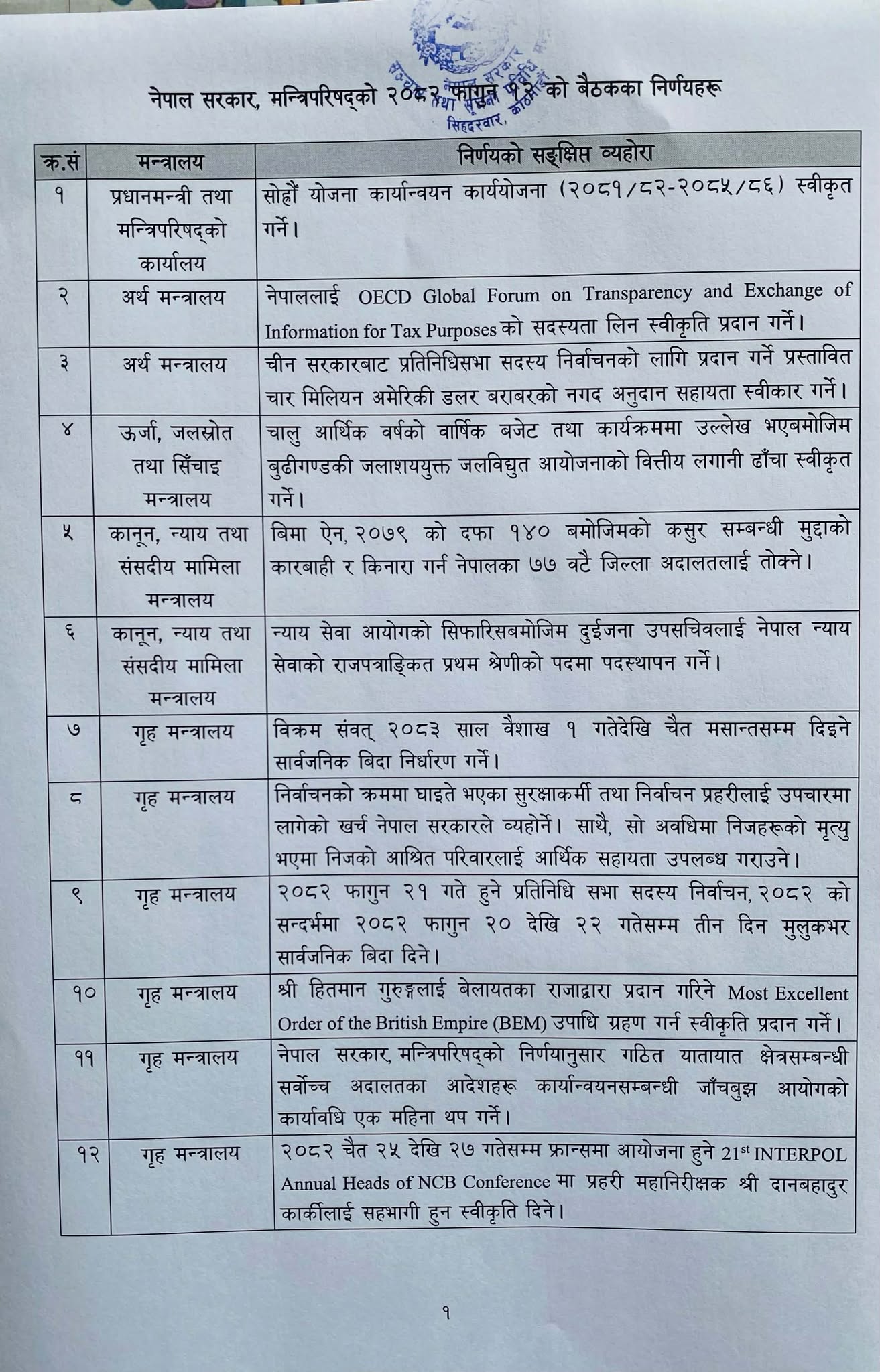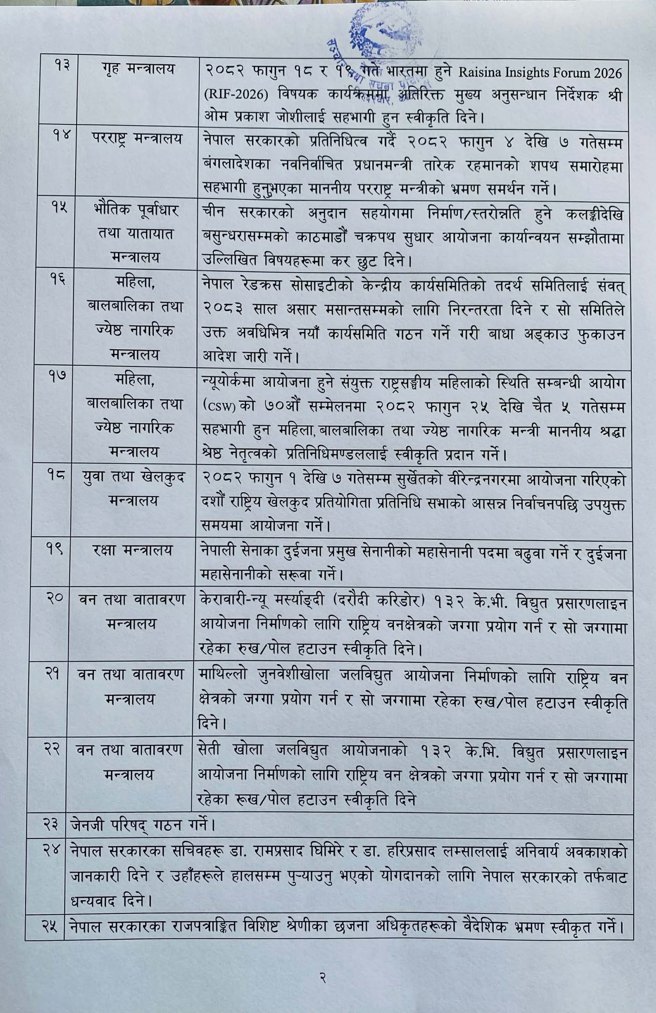 यसैगरी, सरकारले यातायात क्षेत्रसम्बन्धी सर्वोच्च अदालत का आदेश कार्यान्वयनबारे अध्ययन गर्न बनेको जाँचबुझ आयोगको कार्यअवधि एक महिना थप गरेको छ। १६औँ योजना कार्यान्वयन कार्ययोजना (२०८१/८२–२०८५/८६) पनि स्वीकृत गरिएको छ।